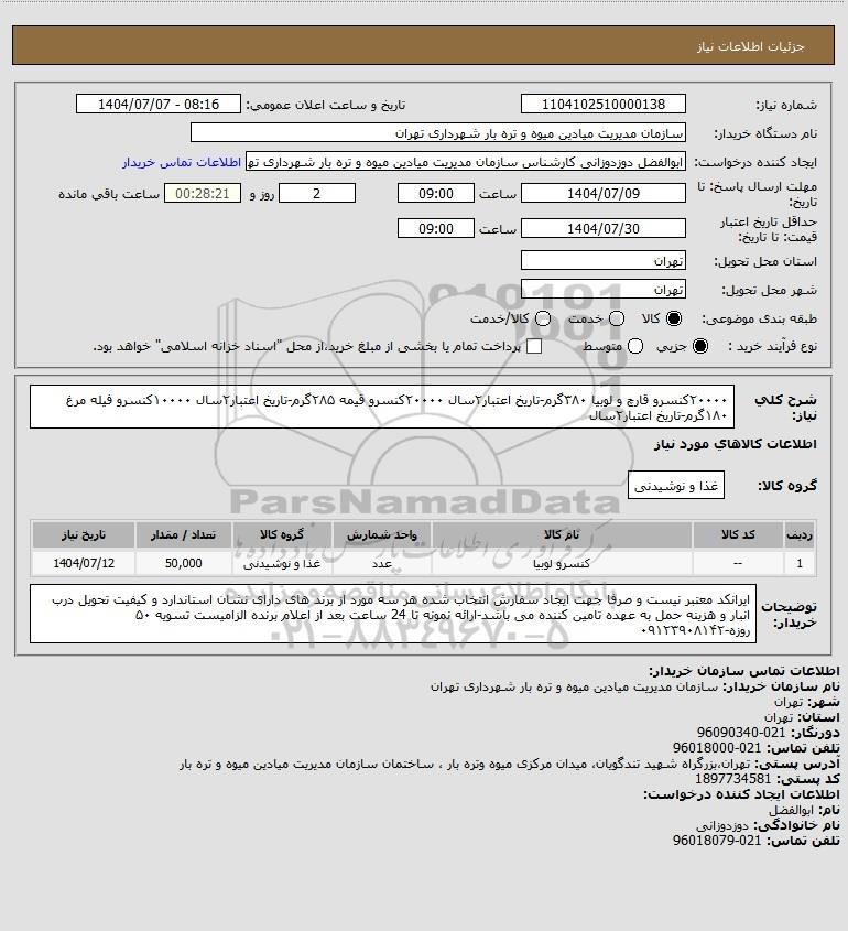 شرح کلی نیاز: ۲۰۰۰۰کنسرو قارچ و لوبیا ۳۸۰گرم-تاریخ اعتبار۲سال
