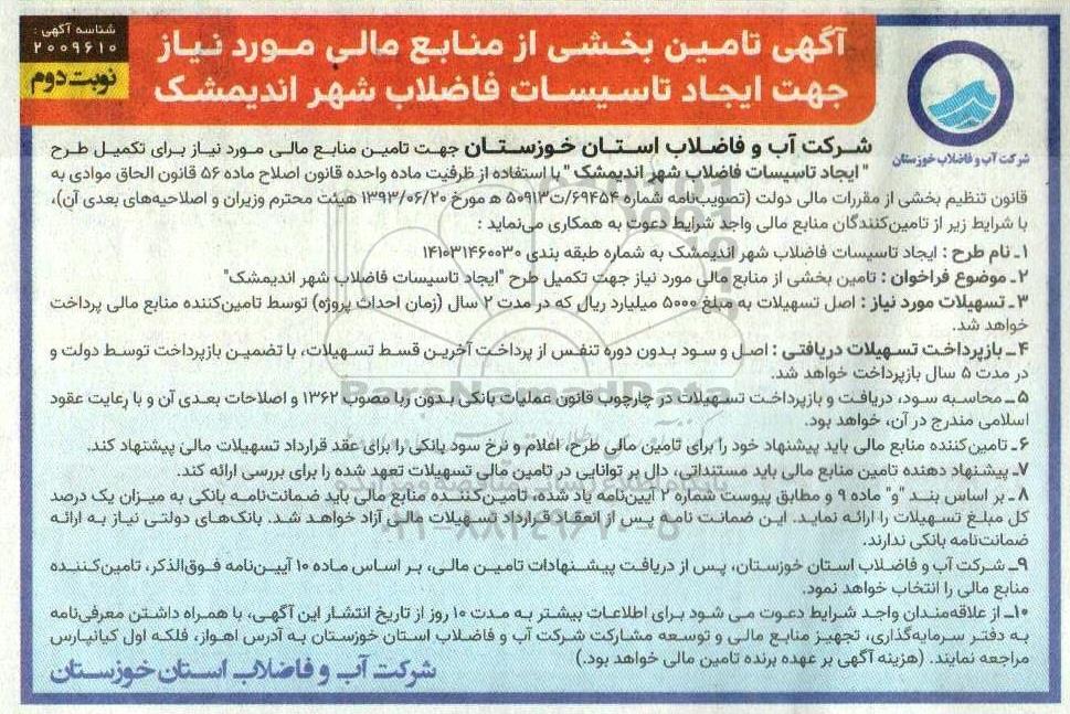 شرکت آب و فاضلاب استان خوزستان جهت تامین منابع مالی مورد نیاز برای تکمیل طرح " ایجاد تاسیسات فاضلاب شهر اندیمشک " با استفاده از ظرفیت ماده واحده قانون اصلاح ماده 56 قانون الحاق موادی به قانون تنظیم بخشی از مقررات مالی دولت (تصویب نامه شماره 69454. ت 50913 ه مورخ 1393.06.20 هیئت محترم وزیران و اصلاحیه های بعدی آن، با شرایط زیر از تامین کنندگان منابع مالی واجد شرایط دعوت به همکاری می نماید
