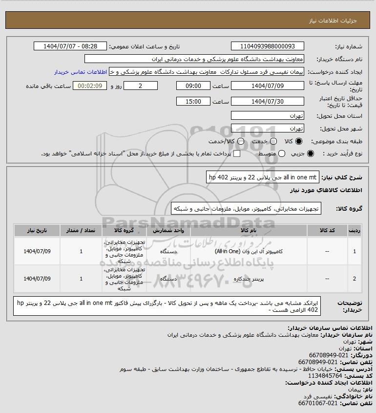 توضیحات خریدار:ایرانکد مشابه می باشد -پرداخت یک ماهه و پس از تحویل کالا - بارگزرای پیش فاکتور all in one mt جی پلاس 22 و پرینتر hp 402 الزامی هست -