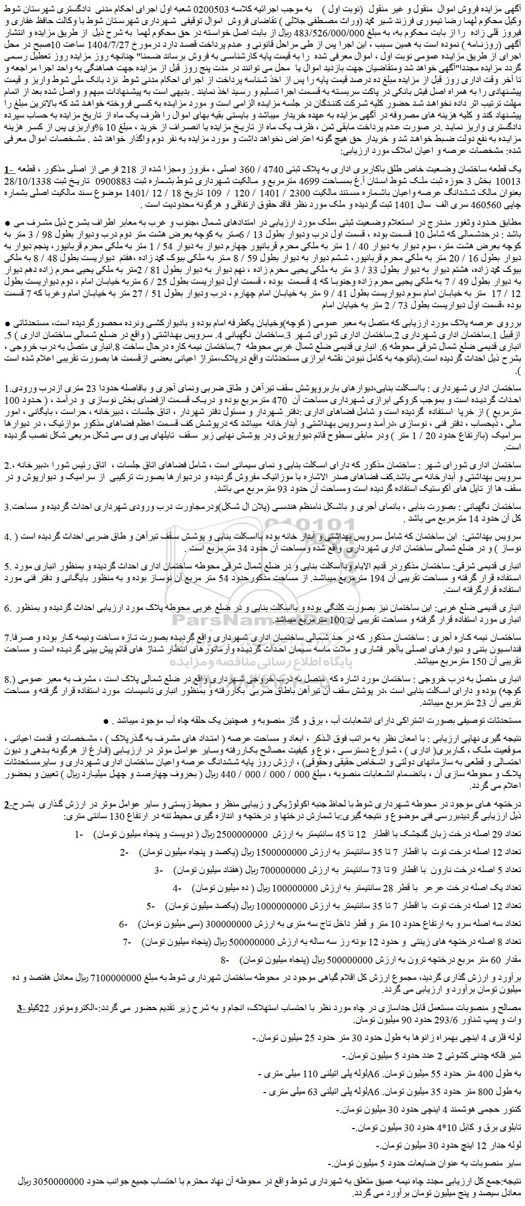 آگهی مزایده فروش اموال منقول و غیر منقول (نوبت اول ) به موجب اجرائیه کلاسه 0200503 شعبه اول اجرای احکام مدنی دادگستری شهرستان شوط وکیل محکوم لهما رضا تیموری فرزند شیر محمد (وراث مصطفی جلالی ) تقاضای فروش اموال توقیفی شهرداری شهرستان شوط با وکالت حافظ غفاری و فیروز قلی زاده را از بابت محکوم به، به مبلغ 483/526/000/000 ریال از بابت اصل خواسته در حق محکوم لهما به شرح ذیل از طریق مزایده و انتشار آگهی (روزنامه ) نموده است به همین سبب ، این اجرا پس از طی مراحل قانونی و عدم پرداخت قصد دارد درمورخ 1404/7/27 ساعت 10صبح در محل اجرای از طریق مزایده عمومی نوبت اول ، اموال معرفی شده را به قیمت پایه کارشناسی به فروش برساند ضمنا" چنانچه روز مزایده روز تعطیل رسمی گردد مزایده مجددا"آگهی خواهد شد ومتقاضیان جهت بازدید اموال یا محل می توانند در مدت پنج روز قبل از مزایده جهت هماهنگی به واحد اجرا مراجعه و تا آخر وقت اداری روز قبل از مزایده مبلغ ده درصد قیمت پایه را پس از اخذ شناسه پرداخت از اجرای احکام مدنی شوط نزد بانک ملی شوط واریز و قیمت پیشنهادی را به همراه اصل فیش بانکی در پاکت سربسته به قسمت اجرا تسلیم و رسید اخذ نمایند . بدیهی است به پیشنهادات مبهم و واصل شده بعد از اتمام مهلت ترتیب اثر داده نخواهد شد حضور کلیه شرکت کنندگان در جلسه مزایده الزامی است و مورد مزایده به کسی فروخته خواهد شد که بالاترین مبلغ را پیشنهاد کند و کلیه هزینه های مصروفه در آگهی مزایده به عهده خریدار میباشد و بایستی بقیه بهای اموال را ظرف یک ماه از تاریخ مزایده به حساب سپرده دادگستری واریز نماید .در صورت عدم پرداخت مابقی ثمن ، ظرف یک ماه از تاریخ مزایده یا انصراف از خرید ، مبلغ 10 %واریزی پس از کسر هزینه مزایده به نفع دولت ضبط خواهد شد و خریدار حق هیچ گونه اعتراض نخواهد داشت و مورد مزایده به نفر دوم واگذار خواهد شد . مشخصات اموال معرفی شده: مشخصات عرصه و اعیان املاک مورد ارزیابی: