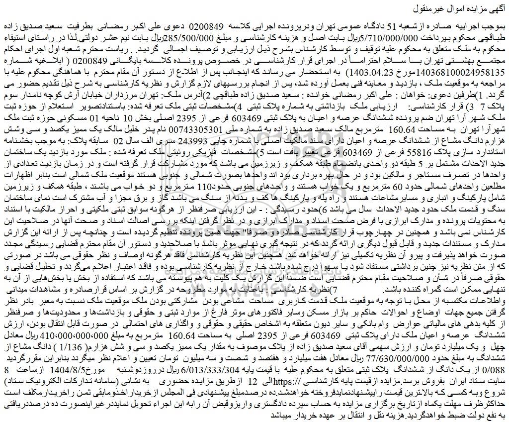 بموجب اجراییه صادره ازشعبه 51 دادگاه عمومی تهران ودرپرونده اجرایی کلاسه 0200849 دعوی علی اکبر رمضانی بطرفیت سعید صدیق زاده طباقچی محکوم بپرداخت 5/710/000/000ریال بابت اصل و هزینه کارشناسی و مبلغ 285/500/000ریال بابت نیم عشر دولتی.لذا در راستای استیفاء محکوم به ملک متعلق به محکوم علیه توقیف و توسط کارشناس بشرح ذیل ارزیابی و توصیف اجمالی گردید. . ریاست محترم شعبه اول اجرای احکام مجتمع بهشتی تهران با سلام احتراماً در اجرای قرار کارشناسی در خصوص پرونده کلاسه بایگانی 0200849 ( ابلاغیه شماره 140368100024958135مورخ 1403.04.23) به استحضار می رساند که اینجانب پس از اطلاع از دستور آن مقام محترم با هماهنگی محکوم علیه با مراجعه به موقعیت ملک ، بازدید و معاینه فنی بعمل آورده شد، پس از انجام بررسیهای لازم گزارش و نظریه کارشناسی به شرح ذیل تقدیم حضور می گردد. 1)طرفین دعوی: خواهان : علی اکبر رمضانی خوانده : سعید صدیق زاده طباقچی 2)آدرس ملک: تهران مرزداران خیابان آرش کوچه نامدار سوم پلاک 7 3) قرار کارشناسی: ارزیابی ملک بازداشتی به شماره پلاک ثبتی 4)مشخصات ثبتی ملک تعرفه شده: باستنادتصویر استعلام از حوزه ثبت ملک شهر آرا تهران ضم پرونده ششدانگ عرصه و اعیان به پلاک ثبتی 603469 فرعی از 2395 اصلی بخش 10 ناحیه 01 مسکونی حوزه ثبت ملک شهرآرا تهران به مساحت 160.64 مترمربع مالک سعید صدیق زاده به شماره ملی 00743305301 نام پدر خلیل مالک یک ممیز یکصد و سی وشش هزارم دانگ مشاع از ششدانگ عرصه و اعیان دارای سند مالکیت اصلی با شماره چاپی 243993 سری الف سال 02 سابقه پلاک: به موجب بخشنامه استاندارد سازی پلاک 55816 فرعی از 603469 فرعی تغییر یافت است 5)مشخصات فیزیکی روئیتی ملک تعرفه شده : ملک مورد بازدید یک ساختمان جدید الاحداث مشتمل بر 5 طبقه دو واحدی بانضمام طبقه همکف و زیرزمین می باشد که مورد مشارکت قرار گرفته است و در زمان بازدید تعدادی از واحدها در تصرف مستاجر و مالکین بود و در حال بهره برداری بود اند واحدها بصورت شمالی و جنوبی هستند موقعیت ملک شمالی است بنابر اظهارات مطلعین واحدهای شمالی حدود 60 مترمربع و یک خواب هستند و واحدهای جنوبی حدود110 مترمربع و دو خواب می باشند ، طبقه همکف و زیرزمین شامل پارکینگ و انباری و مسایرمشاعات هستند و راه پله و پارکینگ ها کف و بدنه از سنگ می باشد گاز و برق مجزا و آب مشترک است نمای ساختمان سنگ و قدمت ملک حدود جدید الاحداث سال می باشد 6)حدود رسیدگی : - این ارزیابی صرفنظر از هرگونه سوابق ثبتی ملکیتی و احراز مالکیت با استناد به محتویات پرونده و مدارک ابرازی با فرض صحت اسناد و مدارک ابرازی و در نظر گرفتن اینکه بررسی اصالت اسناد و صحت آنها در صلاحیت این کارشناس نمی باشد و همچنین در چهارچوب قرار کارشناسی صادره و صرفا" جهت همین پرونده تنظیم گردیده است و چنانچـه پس از ارائه این گزارش مدارک و مستندات جدید و قابل قبول دیگری ارائه گردد که در نتیجه گیری نهایی موثر باشد با صلاحدید و دستور آن مقام محترم قضایی رسیدگی مجدد صورت خواهد پذیرفت و پیرو آن نظریه تکمیلی نیز ارائه خواهد شد. همچنین این نظریه کارشناسی فاقد هرگونه اوصاف و نظر حقوقی می باشد در صورتی که از متن نظریه نیز چنین برداشتی مستفاد شود یا سهوأ درج شده باشد خارج از نظریه کارشناسی بوده و فاقد اعتبار اعلام می گردد و تحلیل قضایی و حقوقی صرفاً در شأن و صلاحیت مقام محترم قضایی است ضمنأ این گزارش یک کلیت به هم پیوسته می باشد که استفاده از بخش یا بخش هایی از آن به تنهایی ممکن است گمراه کننده باشد. 7)نظریه کارشناسی : باعنایت به موارد مطروحه در گزارش بر اساس قرارصادره و مشاهدات میدانی واطلاعات مکتسبه از محل با توجه به موقعیت ملک قدمت کاربری مساحت مشاعی بودن مشارکتی بودن ملک موقعیت ملک نسبت به معبر بادر نظر گرفتن جمیع جهات اوضاع و احوالات حاکم بر بازار مسکن وسایر فاکتورهای موثر فارغ از موارد ثبتی و حقوقی و بازداشت ها و محدودیت ها و صرفنظر از کلیه بدهی های مالیاتی عوارض وام بانکی و سایر دیون متعلقه به اشخاص حقیقی 