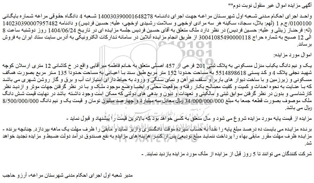 واحد اجرای احکام مدنی شعبه اول شهرستان مراغه جهت اجرای دادنامه 140030390001648278 شعبه 4 دادگاه حقوقی مراغه شماره بایگانی 0100100/ج.م 1 (لهم: بلال، سجاد، سکینه هر سه مرادی اوخچی و سلامت رشیدی اوخچی، علیه: حسین فردیس) و دادنامه 140230390007957482 (له: فرحناز زینلی و علیه: حسین فردیس) در نظر دارد ملک متعلق به آقای حسین فردیس جلسه مزایده ای در تاریخ 1404/06/24 روز دوشنبه ساعت 8 الی 12 صبح به شماره حراج 30041085490000118 از طریق انجام مزایده آنلاین در سامانه تدارکات الکترونیکی به آدرس سایت ستاد ایران به فروش برساند.