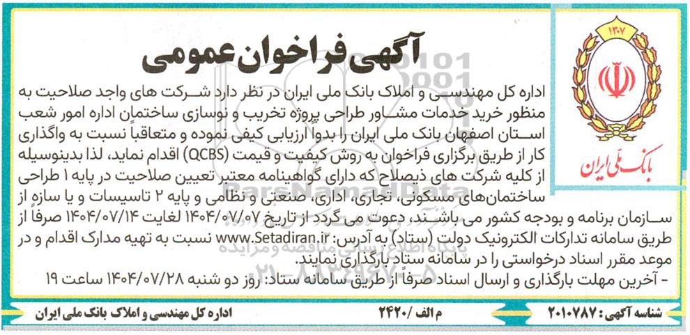 اداره کل مهندسی و املاک بانک ملی ایران در نظر دارد شرکتهای واجد صلاحیت به منظور خرید خدمات مشاور طراحی پروژه تخریب و نوسازی ساختمان اداره امور شعب استان اصفهان بانک ملی ایران را بدوا ارزیابی کیفی نموده و متعاقبا نسبت به واگذاری کار از طریق برگزاری فراخوان به روش کیفیت و قیمت (QCBS) اقدام نماید، لذا بدینوسیله از کلیه شرکتهای ذیصلاح که دارای گواهینامه معتبر تعیین صلاحیت در پایه 1 طراحی ساختمانهای مسکونی تجاری اداری صنعتی و نظامی و پایه 2 تاسیسات و یا سازه از سازمان برنامه و بودجه کشور میباشند دعوت میگردد از تاریخ 1404.7.7 لغایت 1404.7.14 صرفا از طریق سامانه تدارکات الکترونیک دولت (ستاد) به آدرس: ستاد ایران نسبت به تهیه مدارک اقدام و در موعد مقرر اسناد درخواستی را در سامانه ستاد بارگذاری نمایند.