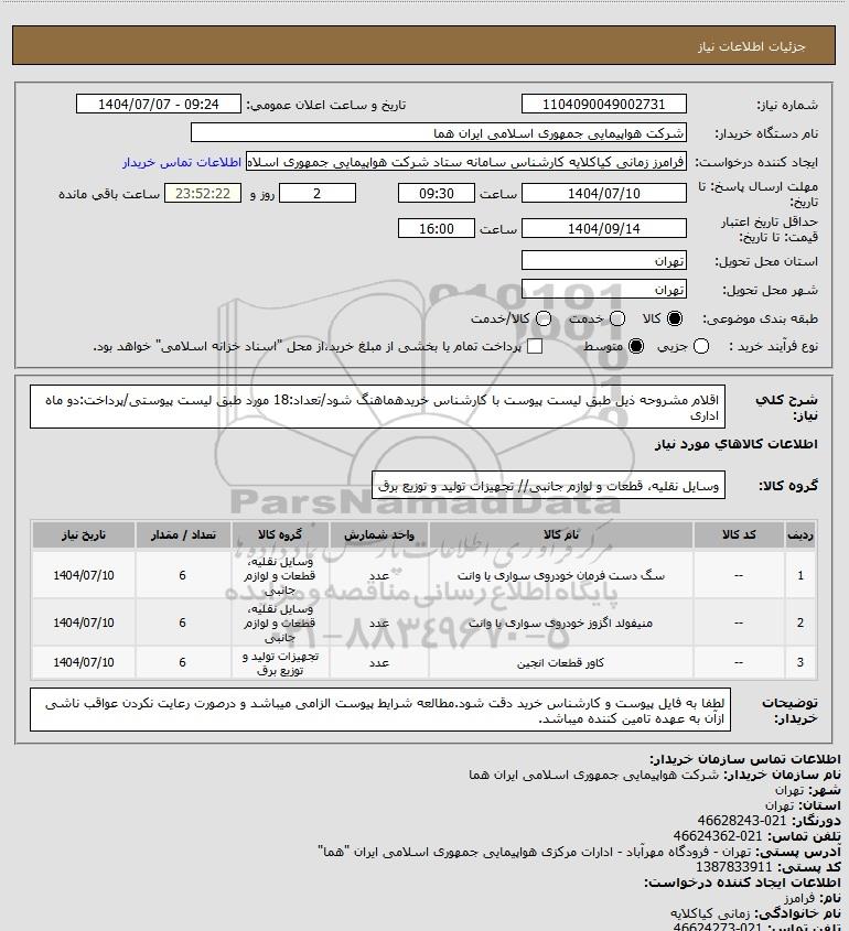 | 1 | -- | سگ دست فرمان خودروی سواری یا وانت | عدد | وسایل نقلیه، قطعات و لوازم جانبی | 6 | 1404/07/10 |