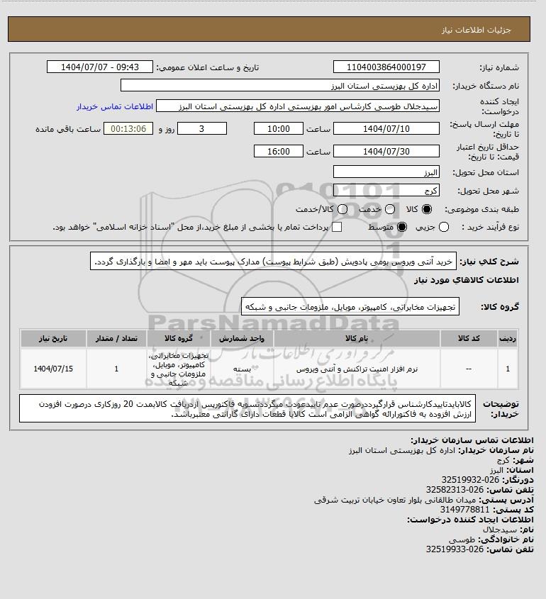 | 1 | -- | نرم افزار امنیت تراکنش و آنتی ویروس | بسته | تجهیزات مخابراتی، کامپیوتر، موبایل، ملزومات جانبی و شبکه | 1 | 1404/07/15 |