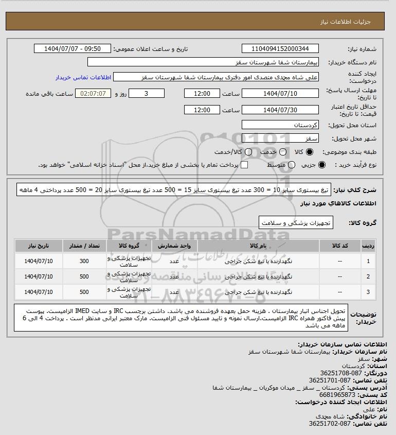 استعلام تیغ بیستوری سایز 10 = 300 عدد تیغ بیستوری سایز 15 = 500 عدد تیغ بیستوری سایز 20 = 500 عدد پرداختی 4 ماهه, استعلام تیغ بیستوری سایز 10 = 300 عدد تیغ بیستوری سایز 15 = 500 عدد تیغ بیستوری سایز 20 = 500 عدد پرداختی 4 ماهه