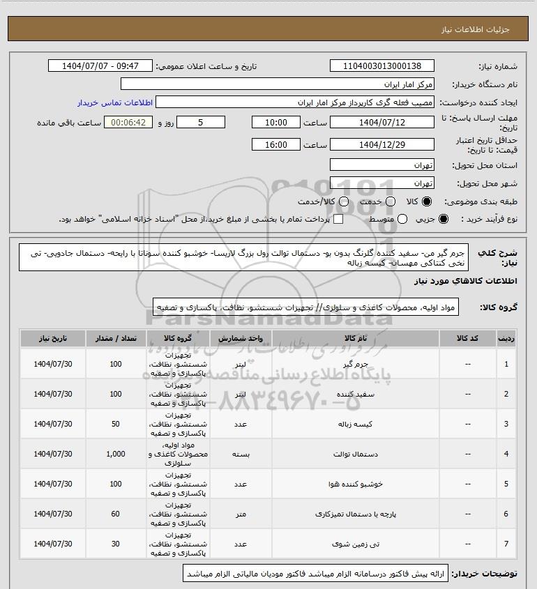 | 5 | -- | خوشبو کننده هوا | عدد | تجهیزات شستشو، نظافت، پاکسازی و تصفیه | 100 | 1404/07/30 |