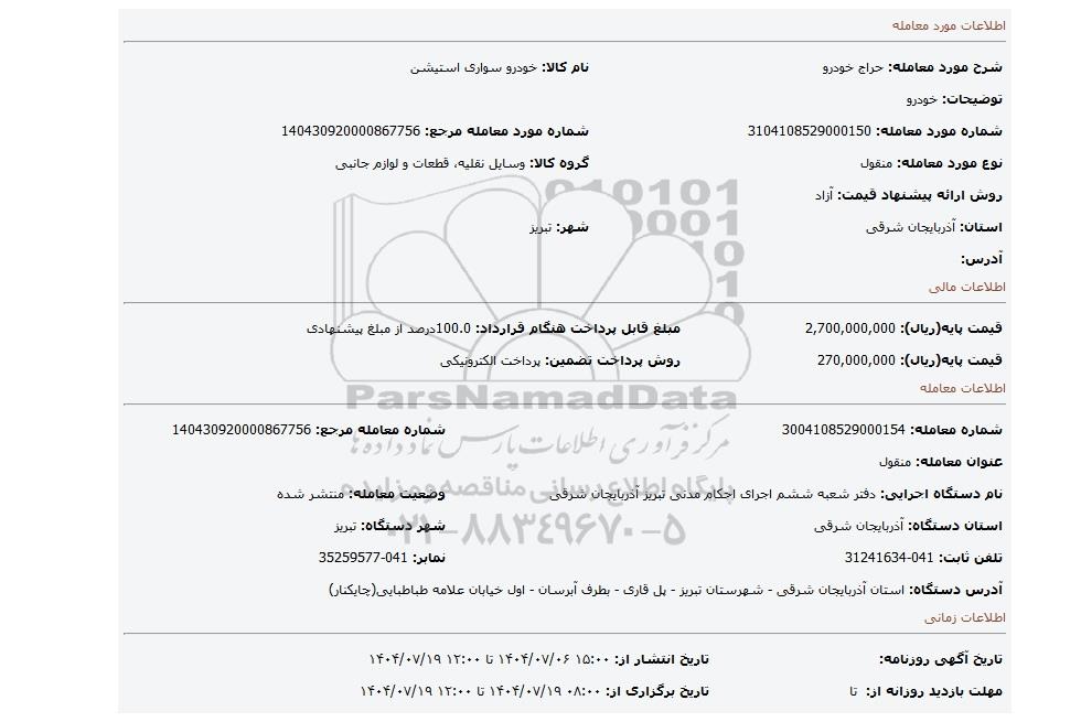 نام دستگاه اجرایی: دفتر شعبه ششم اجرای احکام مدنی تبریز آذربایجان شرقیوضعیت معامله: منتشر شده