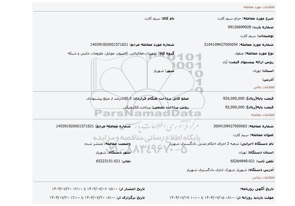 شرح مورد معامله: حراج سیم کارتنام کالا: سیم کارت