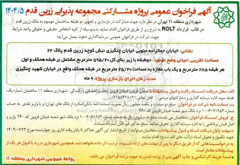 شهرداری منطقه 11 تهران در نظر دارد جهت مشارکت در بازسازی و تجهیز دو طبقه ساختمان موسوم به ملک زرین قدم در قالب قرارداد ROLT به شرح زیر از طریق فراخوان اقدام نماید. بدینوسیله از کلیه اشخاص حقیقی و حقوقی واجد شرایط جهت شرکت در فراخوان عمومی سرمایه گذاری دعوت بعمل می آید؛