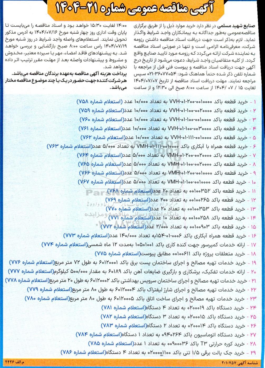 صنایع شهید مسلمی در نظر دارد خرید موارد ذیل را از طریق برگزاری مناقصه عمومی به طور جداگانه به پیمانکاران واجد شرایط واگذار نماید. لازم به ذکر است جهت دریافت اسناد مناقصه داشتن رزومه شرکت معرفی نامه الزامی است و تنها در صورتی اسناد مناقصه به نماینده شرکت ارائه میگردد که رزومه مورد تایید صنایع واقع گردد. از کلیه متقاضیان واجد شرایط دعوت میشود از تاریخ درج آگهی جهت دریافت اسناد مناقصه و پیوست فنی قبل از مراجعه با شماره تلفن ذکر شده حتماً هماهنگ شود 36077054-021  سپس مراجعه نمایند مهلت دریافت اسناد مناقصه از تاریخ 1404.7.7 لغایت 1404.7.15 از ساعت 8 صبح الی12.30  و از ساعت 14 لغایت 15.30 خواهد بود و اسناد مناقصه را میبایست تا پایان وقت اداری روز چهار شنبه مورخ 1404.7.16 به آدرس مذکور تحویل نمایند استعلامهای واصله واجد شرایط در روز شنبه مورخ 1404.7.19 راس ساعت 8 صبح بازگشایی و بررسی خواهد شد. به پیشنهادهای فاقد امضاء، مهر یا سپرده معتبر مخدوش و مشروط و پیشنهادات واصله بعد از مهلت مقرر ترتیب اثر داده نخواهد شد.