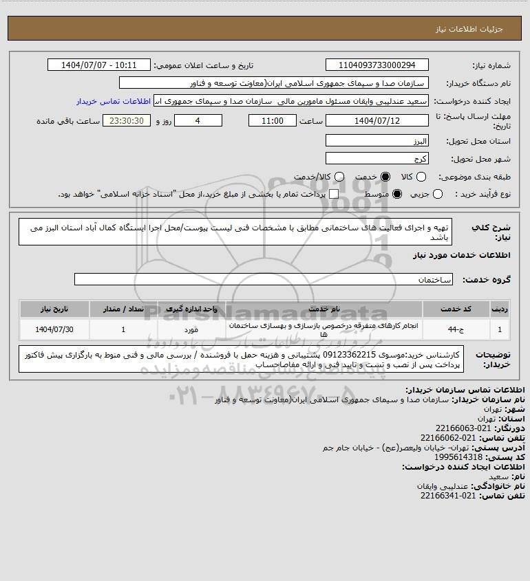 نام دستگاه خریدار: سازمان صدا و سیمای جمهوری اسلامی ایران(معاونت توسعه و فناور