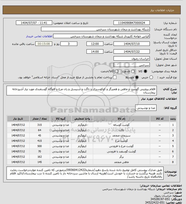 شرح کلی نیاز: اقلام پروتینی گوشت و ماهی و همبرگر و کوکوسبزی و ناگت و شنیسل و ران مرغ و قلوگاه گوسفندی مورد نیاز آشپزخانه بیمارستان