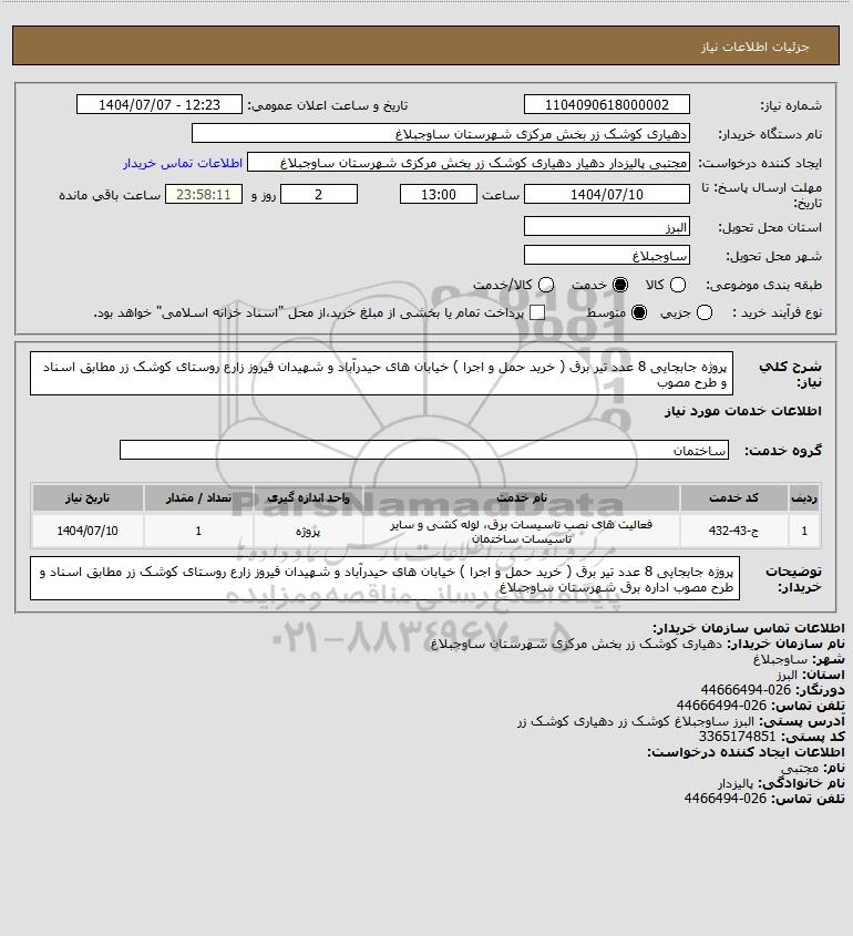 توضیحات خریدار:پروژه جابجایی 8 عدد تیر برق ( خرید حمل و اجرا ) خیابان های حیدرآباد و شهیدان فیروز زارع روستای کوشک زر مطابق اسناد و طرح مصوب اداره برق شهرستان ساوجبلاغ