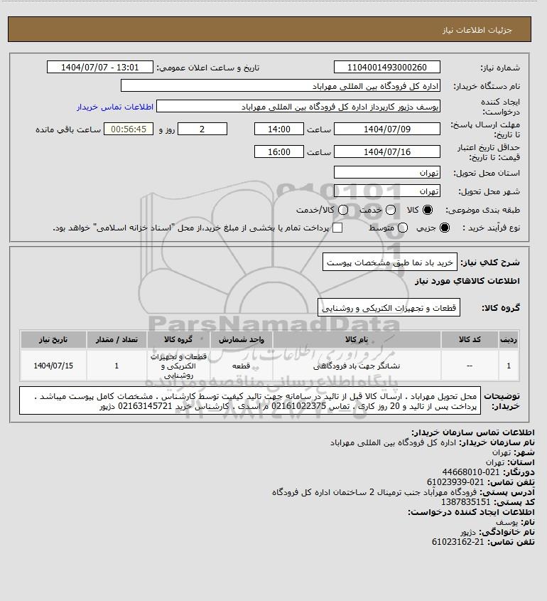 شرح کلی نیاز: خرید باد نما طبق مشخصات پیوست