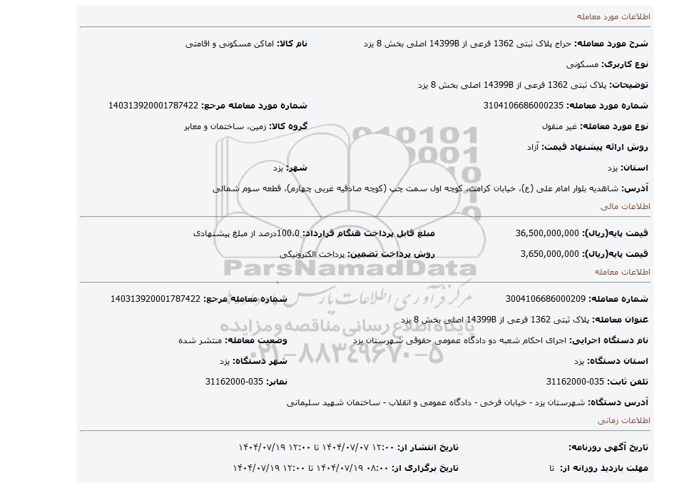 مزایده پلاک ثبتی 1362 فرعی از 14399B اصلی بخش 8 یزد, مزایده، پلاک ثبتی 1362 فرعی از 14399B اصلی بخش 8 یزد