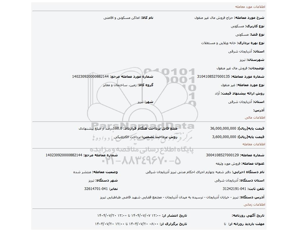 | شماره مورد معامله: 3104108527000135 | شماره مورد معامله مرجع: 140230920000882144 | |