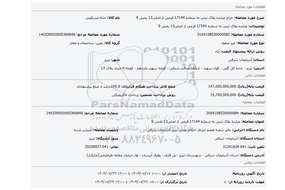 | شرح مورد معامله: حراج مزایده پلاک ثبتی به شماره 17144 فرعی از اصلی13 بخش 9 | نام کالا: خانه مسکونی | |