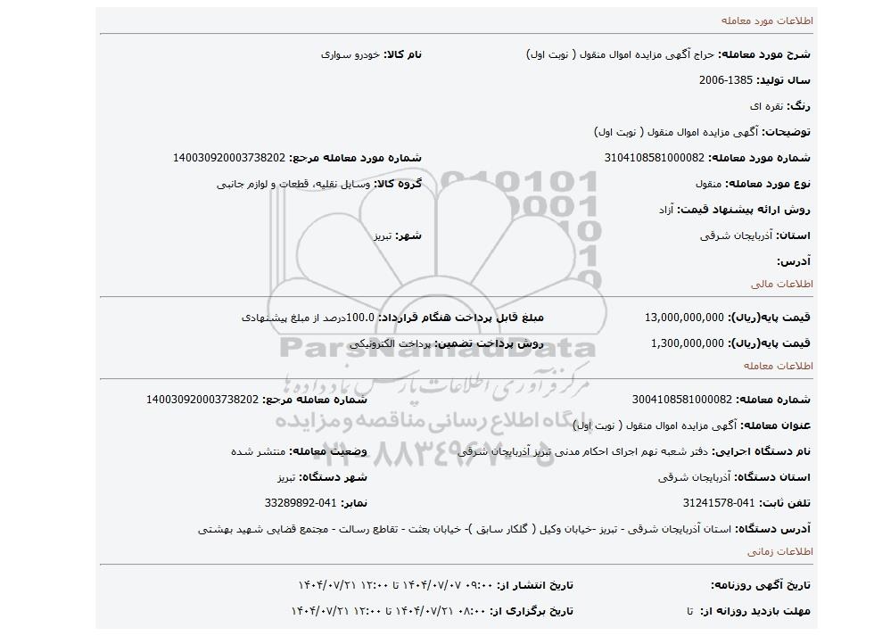 13 مزایده مزایده خودرو 9809890 1404/08/15 new not special not payed تهران