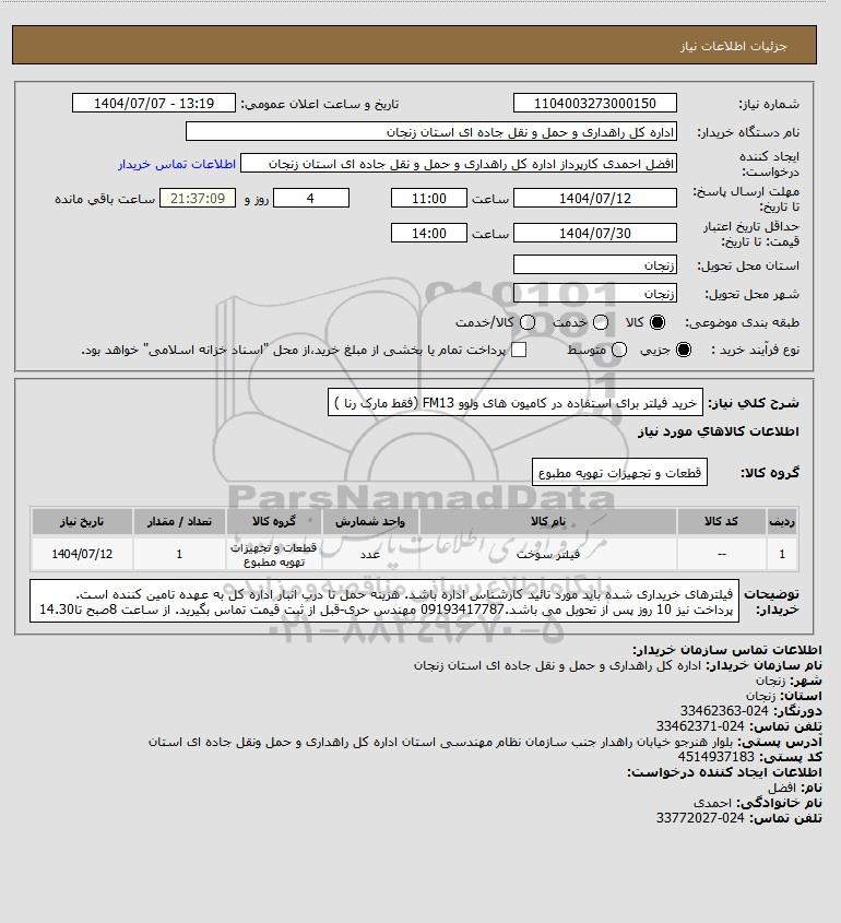 شرح کلی نیاز: خرید فیلتر برای استفاده در کامیون های ولوو FM13 (فقط مارک رنا )