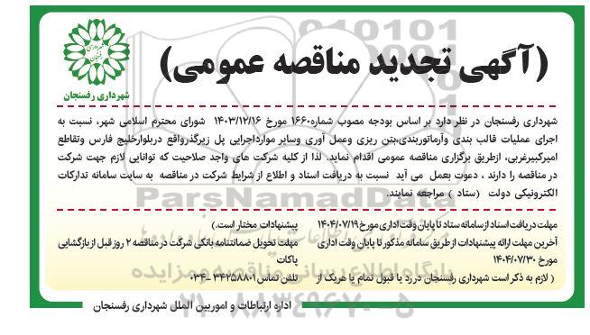 شهرداری رفسنجان در نظر دارد براساس بودجه مصوب شماره 1660 مورخ 1403.12.16 شورای محترم اسلامی شهر، نسبت به اجرای عملیات قالب بندی و آرماتوربندی، بتن ریزی و عمل آوری و سایر موارد اجرایی پل زیرگذر واقع در بلوار خلیج فارس و تقاطع امیرکبیر غربی، از طریق برگزاری مناقصه عمومی اقدام نماید. لذا از کلیه شرکت های واجد صلاحیت که توانایی لازم جهت شرکت در مناقصه را دارند، دعوت بعمل می آید نسبت به دریافت اسناد و اطلاع از شرایط شرکت در مناقصه به سایت سامانه تدارکات الکترونیکی دولت (ستاد) مراجعه نمایند.