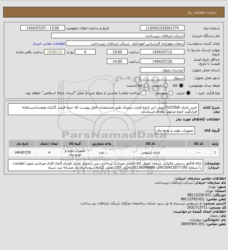 1 -- باتری لیتیومی عدد تجهیزات تولید و توزیع برق 4 1404/07/30