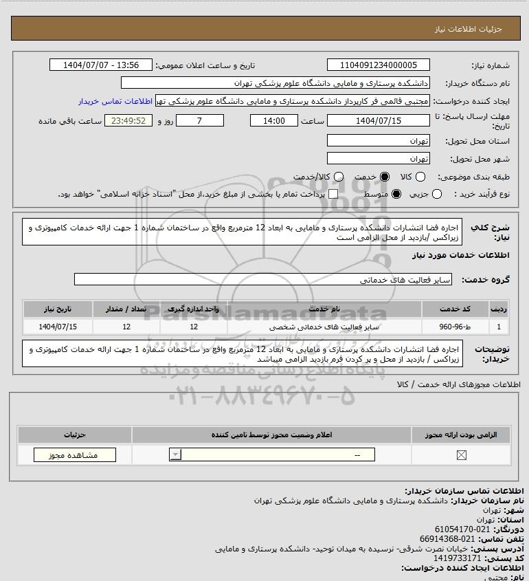 شرح کلی نیاز: اجاره فضا انتشارات دانشکده پرستاری و مامایی به ابعاد 12 مترمربع واقع در ساختمان شماره 1 جهت ارائه خدمات کامپیوتری و زیراکس /بازدید از محل الزامی است