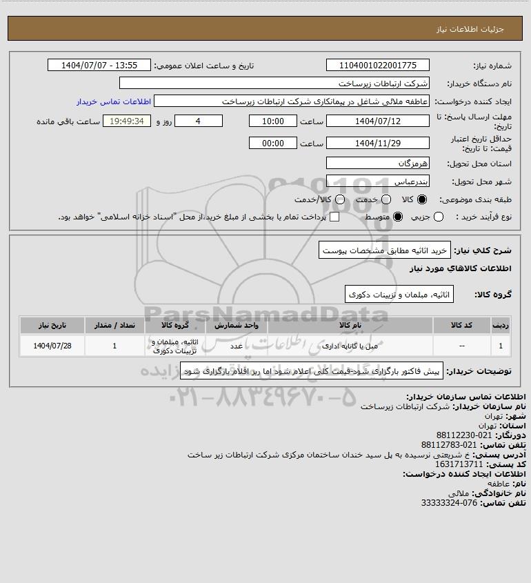شرح کلی نیاز: خرید اثاثیه مطابق مشخصات پیوست