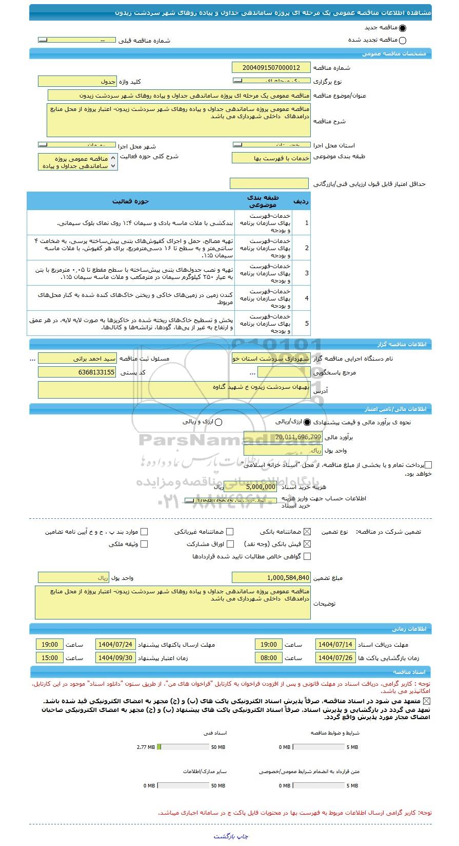 عنوان/موضوع مناقصهمناقصه عمومی یک مرحله ای پروژه ساماندهی جداول و پیاده روهای شهر سردشت زیدون