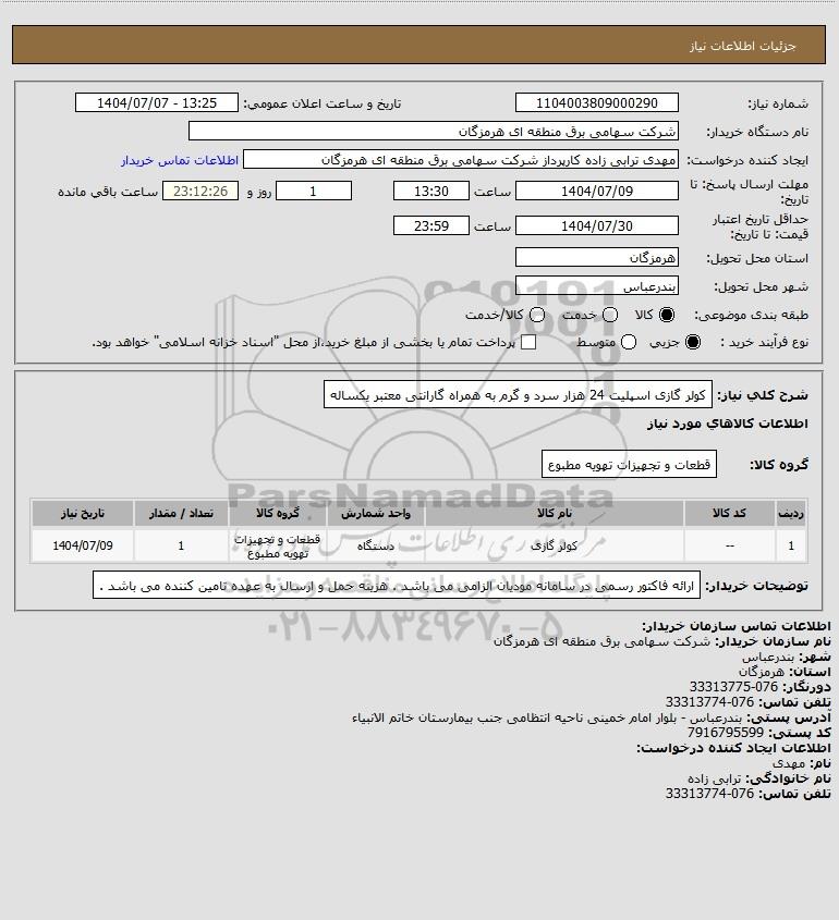 شرح کلی نیاز: کولر گازی اسپلیت 24 هزار سرد و گرم به همراه گارانتی معتبر یکساله
