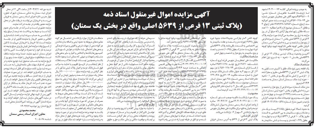 مزایده فروش پلاک 13 فرعی از 5639 اصلی بخش 01 سمنان (سیزده فرعی از پنج هزار و ششصد و سی و نه اصلی) به آدرس سمنان خیابان عالمی کوچه عالمی 5 (کوچه شهید نیکو) کوچه صادق با کد پستی 3516745491