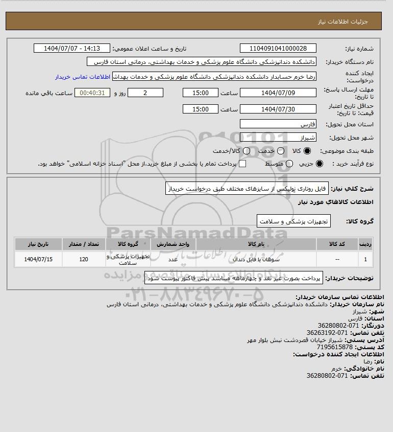 نام دستگاه خریدار:دانشکده دندانپزشکی دانشگاه علوم پزشکی و خدمات بهداشتی، درمانی استان فارس