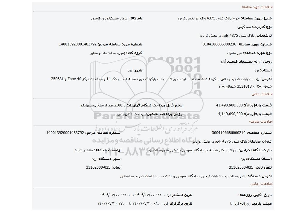 | شرح مورد معامله: حراج پلاک ثبتی 4375 واقع در بخش 2 یزد | نام کالا: اماکن مسکونی و اقامتی | |