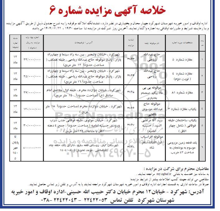 اداره اوقاف و امور خیریه شهرستان شهر کرد چهار محال و بختیاری در نظر دارد، ششدانگ املاک موقوقه را به شرح جدول ذیل از طریق آگهی مزایده و با رعایت شرایط و مقررات اوقافی به اجاره واگذار نماید. آخرین روز شرکت در مزایده تا ساعت 14.30  ، 1404.7.7 می باشد