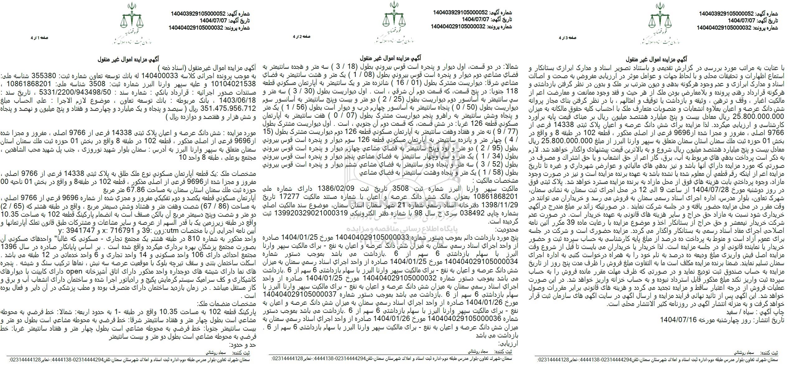 مزایده شش دانگ عرصه و اعیان پلاک ثبتی 14338 فرعی از 9766 اصلی