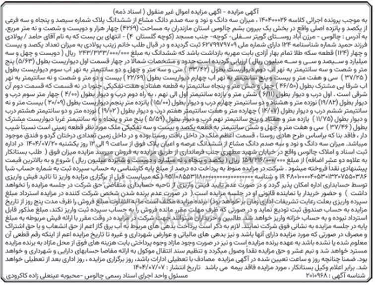 به موجب پرونده اجرائی کلاسه 140400026، میزان سه دانگ و نود و سه صدم دانگ مشاع از ششدانگ پلاک شماره سیصد و پنجاه و سه فرعی از یکصد و پانزده اصلی واقع در بخش یک بیرون بشم چالوس استان مازندران به مساحت (4269) چهار هزار و دویست و شصت و نه متر مربع به آدرس : چالوس - مرزن آباد روستای گویتر سفلی - کوچه جنب مسجد (کوچه گلستان 4) - انتهای بن بست که به نام آقای حامد / پولادی فرزند حمید شماره شناسنامه 124 دارای شماره ملی 6279979709 ثبت گردیده و در قبال طلب خانم زینب پولادی به میزان تعداد یکصد و بیست و چهار (124) قطعه سکه طلا تمام بهار آزادی بابت مهریه بازداشت باشد که ششدانگ به مبلغ 243.333.000.000 ریال (دویست و چهل و سه میلیارد و سیصد و سی و سه میلیون ریال) ارزیابی گردیده است حدود و مشخصات شمالا در چهار قسمت اول دیواریست بطول (5/63) پنج متر و شصت و سه سانتیمتر به نهر آب دوم دیواریست بطول (33/42) سی و سه متر و چهل و دو سانتیمتر به نهر آب سوم دیواریست بطول (37/25) سی و هفت متر و بیست و پنج سانتیمتر به نهر اب چهارم دیواریست بطول (22/69) بیست و دو متر و شصت و نه سانتیمتر به نهر اب شرقا پی مشترک بطول (46/50) چهل و شش متر و پنجاه سانتیمتر به قطعه هفتاد و هفت تفکیکی جنوبا در نه قسمت که قسمت دوم آن شرقی است. اول درب و دیوار بطول 6/11) شش متر و یازده سانتیمتر اول الی نهم به راه دوم درب و دیوار بطول (4/00) چهار متر سوم درب و دیوار بطول (19/82) نوزده متر و هشتاد و دو سانتیمتر چهارم درب و دیوار بطول (15/00) پانزده متر پنجم دیواریست بطول 20/09) بیست مترو نه سانتیمتر ششم درب و دیوار بطول (14/07) چهارده متر و هفت سانتیمتر هفتم درب و دیوار بطول ( 19/02) نوزده متر و دو سانتیمتر هشتم درب و دیوار بطول (1775) یازده متر و هفتاد و پنج سانتیمتر نهم درب و دیوار بطول (5/59) پنج متر و پنجاه و نه سانتیمتر غربا دیواریست مشترک بطول (37/46) سی و هفت متر و چهل و شش سانتیمتر به قطعه یکصد و بیست و سه تفکیکی ملک مورد نظر قطعه زمینی است نسبتاً شیب دار، فاقد بنا که بر اساس طرح هادی روستا، قسمت اعظم ملک در داخل بافت روستا بوده و در داخل زمین تعدادی درختان گردو و فندق موجود میباشد. میزان سه دانگ و نود و سه صدم دانگ مشاع از ششدانگ عرصه و اعیان پلاک فوق از ساعت 9 الی 12 روز یکشنبه 1404.07.20 در اداره ثبت اسناد و املاک چالوس واقع در خیابان شهید مطهری جنب فرمانداری از طریق مزایده به فروش میرسد مزایده میزان فوق ) طلب بستانکار به علاوه دو عشر اضافه از مبلغ 159.216.000.000 ریال ( یکصد و پنجاه و نه میلیارد و دویست و شانزده میلیون ریال ) شروع و به بالاترین قیمت پیشنهادی نقدا فروخته می شود. شرکت در مزایده منوط به پرداخت ده درصد از مبلغ پایه کارشناسی به حساب سپرده ثبت به شماره حساب شبا IR480100004053013207550386 و شناسه 9511085531180000000000000000 (که میبایست قبل از برگزاری مزایده واریز تا تائید فیش واریزی توسط حسابداری اداره امکان پذیر گردد و در صورت عدم تایید فیش واریزی از ناحیه حسابداری متقاضی حق شرکت در جلسه مزایده را نخواهد داشت ) و حضور خریدار با نماینده قانونی او در جلسه مزایده است. در صورت عدم برنده شدن شخص شرکت کننده در مزایده استرداد مبلغ سپرده واریزی بعلت رعایت تشریفات اداری زمان بر خواهد بود برنده مزایده مکلف است ما به التفاوت مبلغ فروش را ظرف مدت پنج روز از تاریخ مزایده به حساب صندوق ثبت تودیع نماید و در صورتی که ظرف مهلت مقرر مانده فروش را به حساب سپرده ثبت واریز نکند. مبلغ مذکور قابل استرداد نبوده و به حساب خزانه واریز خواهد شد. طالبین و خریداران میتوانند جهت شرکت در مزایده در وقت مقرر با ارائه فیش مربوطه به مبلغ پایه در جلسه مزایده به نشانی فوق شرکت نمایند. لازم به ذکر است پرداخت بدهیهای مربوط به آب برق گاز اعم از حق انشعاب و یا حق اشتراک و مصرف در صورتی که مورد مزایده دارای آنها باشد و نیز بدهیهای مالیاتی و عوارض شهرداری و غیره تا تاریخ مزایده اعم از اینکه رقم قطعی آن معلوم شده یا نشده باشد به عهده برنده مزایده است و نیز در صورت وجود مازاد وجوه پرداختی بابت هزینه 