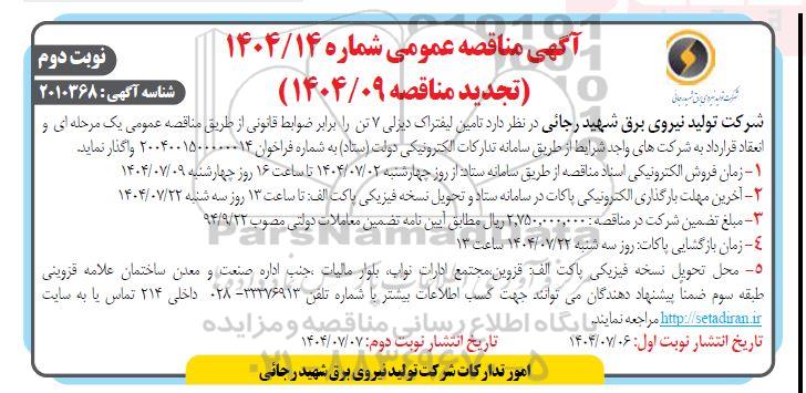 شرکت تولید نیروی برق شهید رجایی در نظر دارد تامین لیفتراک دیزلی 7 تن را برابر ضوابط قانونی از طریق مناقصه عمومی یک مرحله ای و انعقاد قرارداد به شرکتهای واجد شرایط از طریق سامانه تدارکات الکترونیکی دولت (ستاد) به شماره فراخوان 2004001500000014 واگذار نماید.