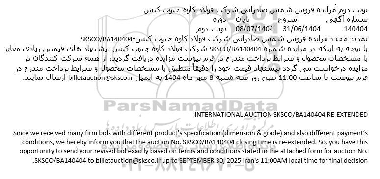 Since we received many firm bids with different product's specification (dimension & grade) and also different payment's conditions, we hereby inform you that the auction No. SKSCO/BA140404 closing time is re-extended. So, you have this opportunity to send your revised bid exactly based on terms and conditions stated in the attached form for auction No..SKSCO/BA140404 to billetauction@sksco.ir up to SEPTEMBER 30, 2025 Iran's 11:00AM local time for final decision