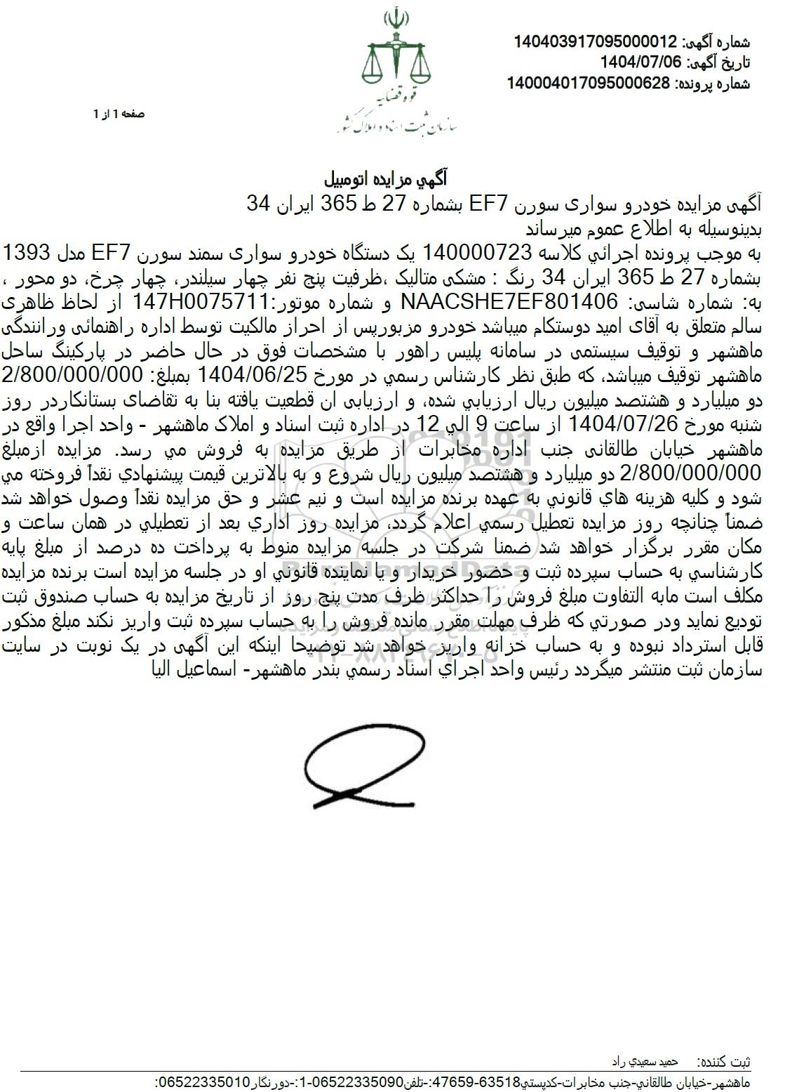 به موجب پرونده اجرائی کلاسه 140000723 یک دستگاه خودرو سواری سمند سورن EF7 مدل 1393 بشماره 27 ط 365 ایران 34 رنگ : مشکی متالیک، ظرفیت پنج نفر چهار سیلندر چهار چرخ دو محور ، و شماره موتور 1470075711 از لحاظ ظاهری NAACSHE7EF801406 به شماره شاسی سالم متعلق به آقای امید دوستکام میباشد خودرو مزبور پس از احراز مالکیت توسط اداره راهنمائی و رانندگی ماهشهر و توقیف سیستمی در سامانه پلیس راهور با مشخصات فوق در حال حاضر در پارکینگ ساحل ماهشهر توقیف میباشد که طبق نظر کارشناس رسمی در مورخ 1404.06.25 بمبلغ : 2.800.000.000 دو میلیارد و هشتصد میلیون ریال ارزیابی شده و ارزیابی آن قطعیت یافته بنا به تقاضای بستانکار در روز شنبه مورخ 1404.07.26 از ساعت 9 الی 12 در اداره ثبت اسناد و املاک ماهشهر - واحد اجرا واقع در ماهشهر خیابان طالقانی جنب اداره مخابرات از طریق مزایده به فروش می رسد. مزایده از مبلغ 2.800.000.000 دو میلیارد و هشتصد میلیون ریال شروع و به بالاترین قیمت پیشنهادی نقدا فروخته می شود و کلیه هزینه های قانونی به عهده برنده مزایده است و نیم عشر و حق مزایده نقداً وصول خواهد شد ضمنا چنانچه روز مزایده تعطیل رسمی اعلام گردد مزایده روز اداری بعد از تعطیلی در همان ساعت و مكان مقرر برگزار خواهد شد ضمنا شرکت در جلسه مزایده منوط به پرداخت ده درصد از مبلغ پایه کارشناسی به حساب سپرده ثبت و حضور خریدار و یا نماینده قانونی او در جلسه مزایده است برنده مزایده مکلف است ما به التفاوت مبلغ فروش را حداکثر ظرف مدت پنج روز از تاریخ مزایده به حساب صندوق ثبت تودیع نماید و در صورتی که ظرف مهلت مقرر مانده فروش را به حساب سپرده ثبت واریز نکند مبلغ مذکور قابل استرداد نبوده و به به حساب خزانه واریز خواهد شد توضیحا اینکه این آگهی در در یک نوبت در سایت سازمان ثبت منتشر میگردد رئیس واحد اجرای اسناد رسمی بندر ماهشهر - اسماعیل الیا