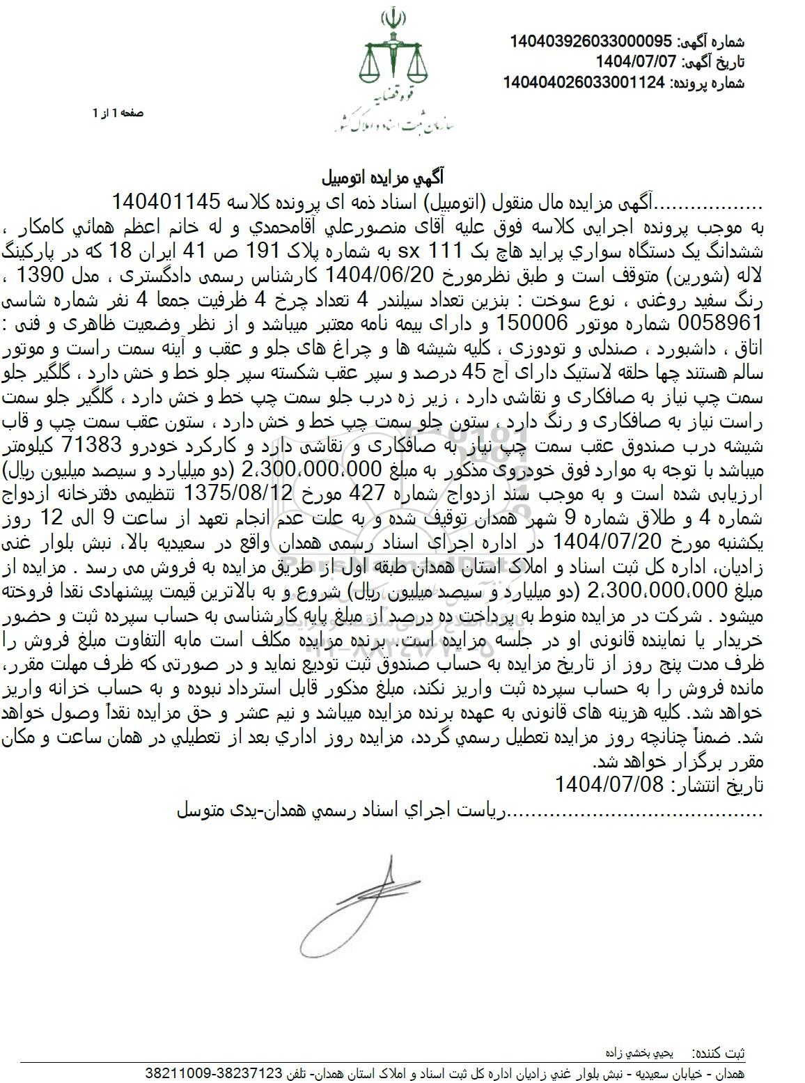 آگهی مزایده مال منقول (اتومبیل) اسناد ذمه ای پرونده کلاسه 140401145 به موجب پرونده اجرایی کلاسه فوق علیه آقای منصور علی آقا محمدی و له خانم اعظم همائی کامکار ،ششدانگ یک دستگاه سواری پراید هاچ بک 111 x به شماره پلاک 191 ص 41 ایران 18 که در پارکینگ لاله (شورین) متوقف است و طبق نظر مورخ 1404.06.20 کارشناس رسمی دادگستری ، مدل 1390 ، رنگ سفید روغنی ، نوع سوخت: بنزین تعداد سیلندر 4 تعداد چرخ 4 ظرفیت جمعا 4 نفر شماره شاسی 0058961 شماره موتور 150006 و دارای بیمه نامه معتبر میباشد و از نظر وضعیت ظاهری و فنی : اتاق ، داشبورد ، صندلی و تودوزی ، کلیه شیشه ها و چراغهای جلو و عقب و اینه سمت راست و موتور سالم هستند چها حلقه لاستیک دارای آج 45 درصد و سپر عقب شکسته سپر جلو خط و خش دارد ، گلگیر جلو سمت چپ نیاز به صافکاری و نقاشی دارد، زیر زه درب جلو سمت چپ خط و خش دارد ، گلگیر جلو سمت راست نیاز به صافکاری و رنگ دارد، ستون جلو سمت چپ خط و خش دارد، ستون عقب سمت چپ و قاب شیشه درب صندوق عقب سمت چپ نیاز به صافکاری و نقاشی دارد و کارکرد خودرو 71383 کیلومتر میباشد با توجه به موارد فوق خودروی مذکور به مبلغ 2.300.000.000 دو میلیارد و سیصد میلیون ریال ارزیابی شده است و به موجب سند ازدواج شماره 427 مورخ 1375.08.12 تنظیمی دفترخانه ازدواج شماره 4 و طلاق شماره 9 شهر همدان توقیف شده و به علت عدم انجام تعهد از ساعت 9 الی 12 روز یکشنبه مورخ 1404.07.20 در اداره اجرای اسناد رسمی همدان واقع در سعیدیه بالا، نبش بلوار غنی زادیان اداره کل ثبت اسناد و املاک استان همدان طبقه اول از طریق مزایده به فروش می رسد . مزایده از مبلغ 2.300.000.000 دو میلیارد و سیصد میلیون ریال شروع و به بالاترین قیمت پیشنهادی نقدا فروخته میشود. شرکت در مزایده منوط به پرداخت ده درصد از مبلغ پایه کارشناسی به حساب سپرده ثبت و حضور خریدار یا نماینده قانونی او در جلسه مزایده است. برنده مزایده مکلف است ما به التفاوت مبلغ فروش را ظرف مدت پنج روز از تاریخ مزایده به حساب صندوق ثبت تودیع نماید و در صورتی که ظرف مهلت مقرر مانده فروش را به حساب سپرده ثبت واریز نکند مبلغ مذکور قابل استرداد نبوده و به حساب خزانه واریز خواهد شد. کلیه هزینه های قانونی به عهده برنده مزایده میباشد و نیم عشر و حق مزایده نقداً وصول خواهد شد. ضمنا چنانچه روز مزایده تعطیل رسمی گردد مزایده روز اداری بعد از تعطیلی در همان ساعت و مکان مقرر برگزار خواهد شد.