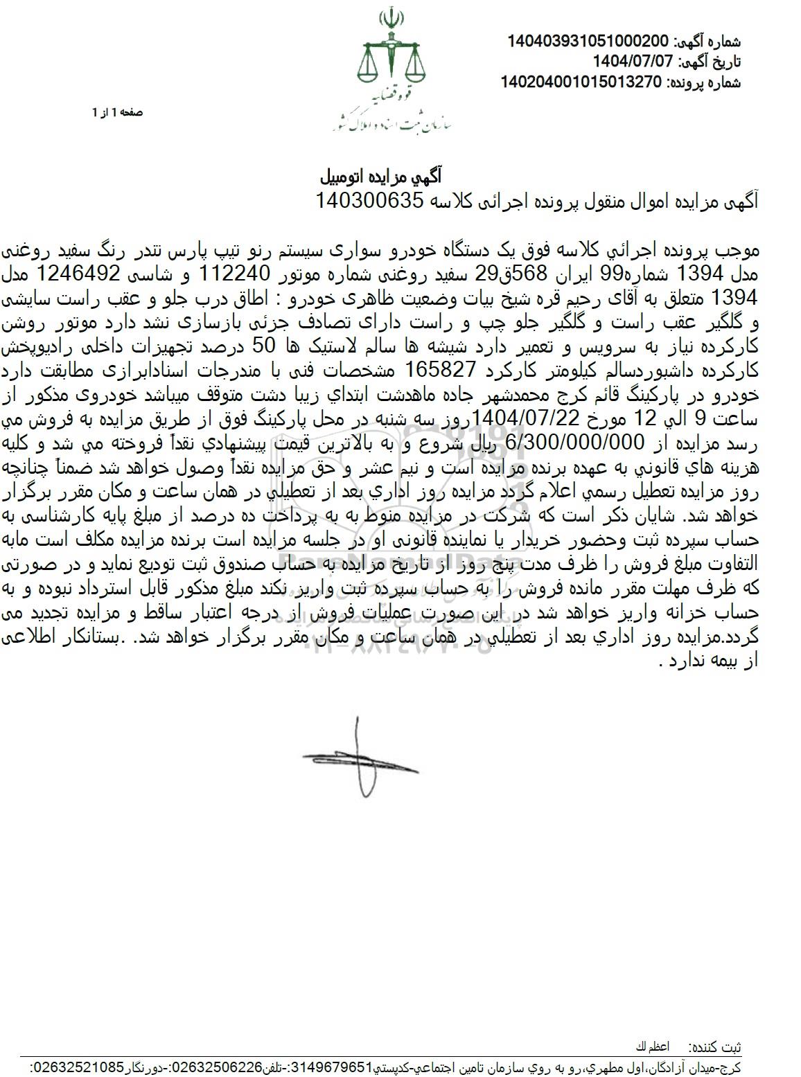 موجب پرونده اجرائی کلاسه فوق یک دستگاه خودرو سواری سیستم رنو تیپ پارس تندر رنگ سفید روغنی مدل 1394 شماره 99 ایران 568ق 29 سفید روغنی شماره موتور 112240 و شاسی 1246492 مدل 1394 متعلق به آقای رحیم قره شیخ بیات وضعیت ظاهری خودرو : اطاق درب جلو و عقب راست سایشی و گلگیر عقب راست و گلگیر جلو چپ و راست دارای تصادف جزئی بازسازی نشد دارد موتور روشن کارکرده نیاز به سرویس و تعمیر دارد شیشه ها سالم لاستیک ها 50 درصد تجهیزات داخلی رادیو پخش کارکرده داشبورد سالم کیلومتر کارکرد 165827 مشخصات فنی با مندرجات اسناد ابرازی مطابقت دارد خودرو در پارکینگ قائم کرج محمد شهر جاده ماهدشت ابتدای زیبا دشت متوقف میباشد خودروی مذکور از ساعت 9 الی 12 مورخ 1404.07.22 روز سه شنبه در محل پارکینگ فوق از طریق مزایده به فروش می رسد مزایده از 6.300.000.000 ریال شروع و به بالاترین قیمت پیشنهادی نقدا فروخته می شد و کلیه هزینه های قانونی به عهده برنده مزایده است و نیم عشر و حق مزایده نقداً وصول خواهد شد ضمنا چنانچه روز مزایده تعطیل رسمی اعلام گردد مزایده روز اداری بعد از تعطیلی در همان ساعت و مکان مقرر برگزار خواهد شد. شایان ذکر است که شرکت در مزایده منوط به به پرداخت ده درصد از مبلغ پایه کارشناسی به حساب سپرده ثبت و حضور خریدار یا نماینده قانونی او در جلسه مزایده است برنده مزایده مکلف است ما به التفاوت مبلغ فروش را ظرف مدت پنج روز از تاریخ مزایده به حساب صندوق ثبت تودیع نماید و در صورتی که ظرف مهلت مقرر مانده فروش را به حساب سپرده ثبت واریز نکند مبلغ مذکور قابل استرداد نبوده و به حساب خزانه واریز خواهد شد در این صورت عملیات فروش از درجه اعتبار ساقط و مزایده تجدید می گردد. مزایده روز اداری بعد از تعطیلی در همان ساعت و مکان مقرر برگزار خواهد شد. . بستانکار اطلاعی از بیمه ندارد .