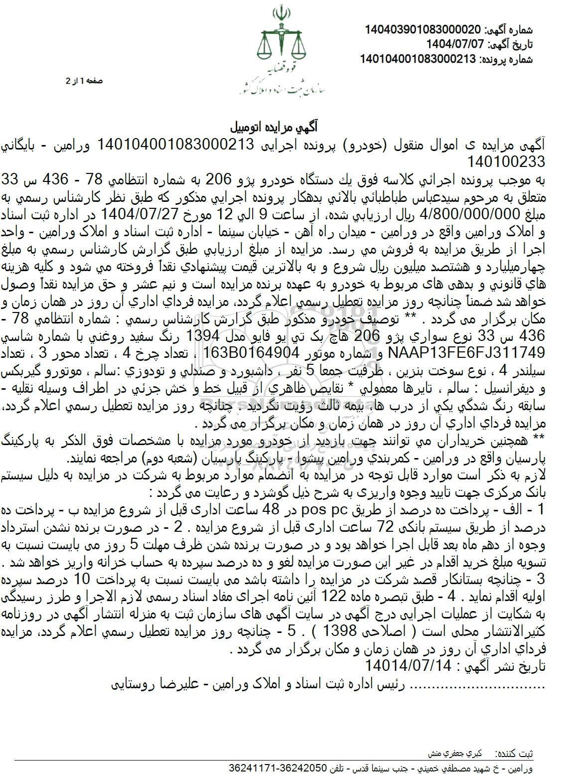 به موجب پرونده اجرائی كلاسه فوق يک دستگاه خودرو پژو 206 به شماره انتظامي 78 - 436 س 33 متعلق به مرحوم سید عباس طباطبائي بالائي بدهکار پرونده اجرایی مذکور که طبق نظر کارشناس رسمي به مبلغ 4.800.000.000 ریال ارزیابی شده از ساعت 9 الی 12 مورخ 1404.07.27 در اداره ثبت اسناد و املاک ورامین واقع در ورامین - میدان راه آهن - خیابان سینما - اداره ثبت اسناد و املاک ورامین - واحد اجرا از طریق مزایده به فروش میرسد مزایده از مبلغ ارزیابی طبق گزارش کارشناس رسمي به مبلغ چهار میلیارد و هشتصد میلیون ریال شروع و به بالاترین قیمت پیشنهادي نقداً فروخته مي شود و کلیه هزینه هاي قانوني و بدهی های مربوط به خودرو به عهده برنده مزایده است و نیم عشر و حق مزايده نقداً وصول خواهد شد ضمنا چنانچه روز مزایده تعطیل رسمی اعلام گردد مزایده فرداي اداري آن روز در همان زمان و مكان برگزار می گردد ** توصیف خودرو مذکور طبق گزارش کارشناس رسمی : شماره انتظامی  78 -436 س 33 نوع سواری پژو 206 هاچ بک تي يو فايو مدل 1394 رنگ سفید روغنی با شماره شاسي و شماره موتور 16380164904 ، تعداد چرخ 4 ، تعداد محور 3 ، تعداد NAAP13FE6FJ311749  و شماره موتور 163B0164904 سیلندر 4 ، نوع سوخت بنزین ، ظرفیت جمعا 5 نفر ، داشبورد و صندلی و تودوزی : سالم ، موتور و گیربکس و دیفرانسیل : سالم ، تایرها معمولي * نقايص ظاهری از قبیل خط و خش جزئی در اطراف وسيله نقليه -سابقه رنگ شدگی یکی از درب ها بیمه ثالث رؤیت نگردید . چنانچه روز مزایده تعطیل رسمی اعلام گردد مزایده فرداي اداري آن روز در همان زمان و مکان برگزار می گردد .