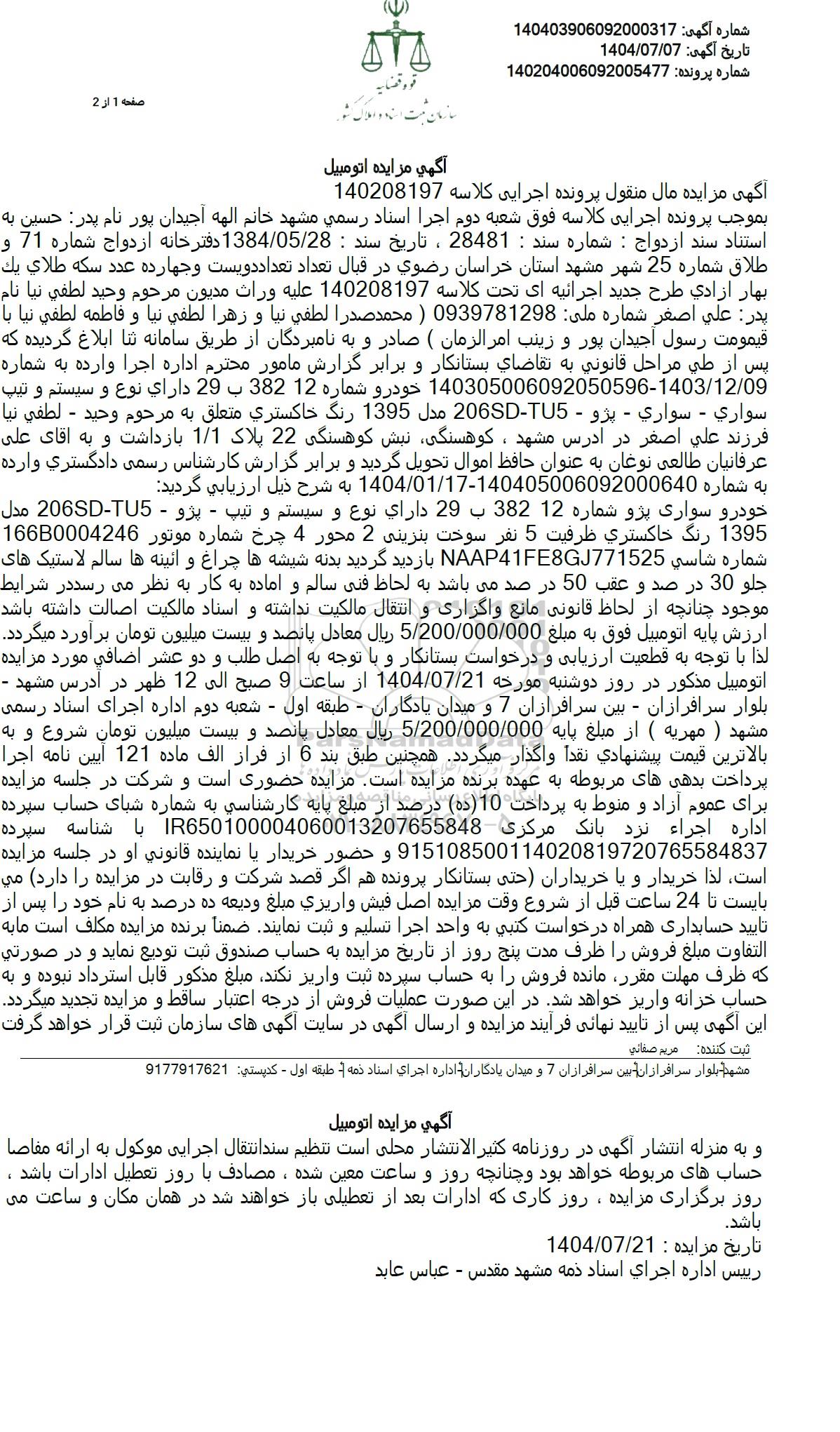 خودرو سواری پژو شماره 12 382 ب 29 دارای نوع و سیستم و تیپ - پژو - 206SD-TU5 مدل 1395 رنگ خاکستری ظرفیت 5 نفر سوخت بنزینی 2 محور 4 چرخ شماره موتور 16680004246 شماره شاسي NAAP41FE8GJ771525 بازدید گردید بدنه شیشه ها چراغ و انینه ها سالم لاستیک های جلو 30 در صد و عقب 50 در صد میباشد به لحاظ فنی سالم و آماده به کار به نظر می رسد در شرایط موجود چنانچه از لحاظ قانونی مانع واگزاری و انتقال مالکیت نداشته و اسناد مالکیت اصالت داشته باشد. ارزش پایه اتومبیل فوق به مبلغ 5.200.000.000 ريال معادل پانصد و بیست میلیون تومان برآورد میگردد. لذا با توجه به قطعیت ارزیابی و درخواست بستانکار و با توجه به اصل طلب و دو عشر اضافی مورد مزایده اتومبیل مذکور در روز دوشنبه مورخه 1404.07.21 از ساعت 9 صبح الى 12 ظهر در آدرس مشهد -بلوار سرافرازان - بین سرافرازان 7 و میدان یادگاران - طبقه اول - شعبه دوم اداره اجرای اسناد رسمی مشهد ( مهریه ) از مبلغ پایه 5.200.000.000 ريال معادل پانصد و بیست میلیون تومان شروع و به بالاترین قیمت پیشنهادی نقدا واگذار میگردد. همچنین طبق بند 6 از فراز الف ماده 121 آیین نامه اجرا پرداخت بدهی های مربوطه به عهده برنده مزایده است. مزایده حضوری است و شرکت در جلسه مزایده برای عموم آزاد و منوط به پرداخت (10 ده) درصد از مبلغ پایه کارشناسی به شماره شبای حساب سپرده اداره اجراء نزد بانک با شناسه سپرده IR650100004060013207655848 بانک مرکزی 915108500114020819720765584837 و حضور خریدار با نماینده قانونی او در جلسه مزایده است لذا خریدار و یا خریداران حتی بستانکار پرونده هم اگر قصد شرکت و رقابت در مزایده را دارد می بایست تا 24 ساعت قبل از شروع وقت مزایده اصل فیش واريزي مبلغ ودیعه ده درصد به نام خود را پس از تایید حسابداری همراه درخواست کتبی به واحد اجرا تسلیم و ثبت نمایند. ضمناً برنده مزایده مکلف است ما به التفاوت مبلغ فروش را ظرف مدت پنج روز از تاریخ مزایده به حساب صندوق ثبت تودیع نماید و در صورتي که ظرف مهلت مقرر مانده فروش را به حساب سپرده ثبت واریز نکند مبلغ مذکور قابل استرداد نبوده و به حساب خزانه واریز خواهد شد. در این صورت عملیات فروش از درجه اعتبار ساقط و مزایده تجدید میگردد. این آگهی پس از تایید نهایی فرایند مزایده و ارسال آگهی در سایت آگهی های سازمان ثبت قرار خواهد گرفت و به منزله انتشار آگهی در روزنامه کثیر الانتشار محلی است تنظیم سند انتقال اجرایی موکول به ارائه مقاضا حساب های مربوطه خواهد بود و چنانچه روز و ساعت معین شده، مصادف با روز تعطیل ادارات باشد . روز برگزاری مزایده، روز کاری که ادارات بعد از تعطیلی باز خواهند شد در همان مکان و ساعت می باشد.