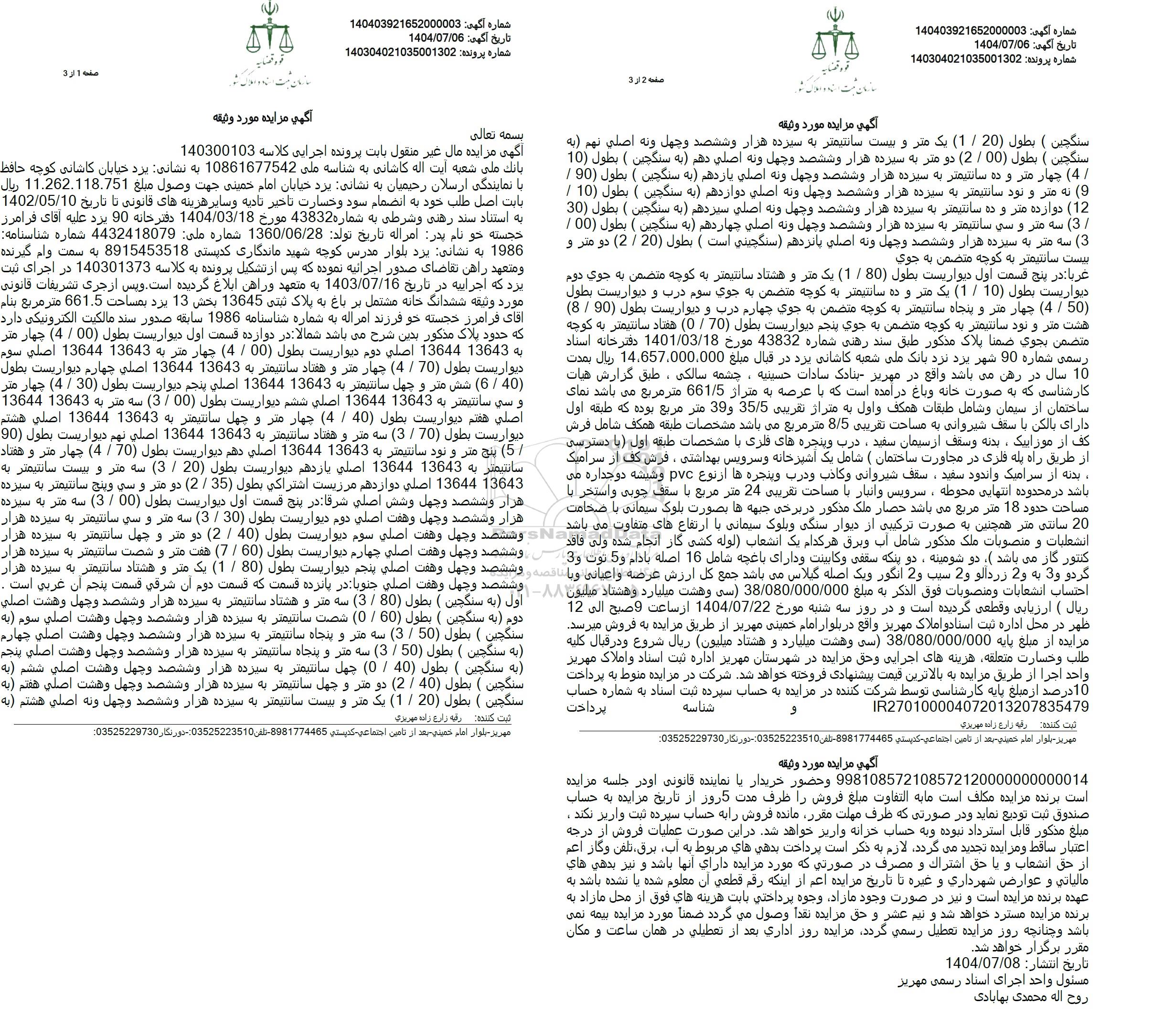 زمان مزایده: روز سه شنبه مورخ 1404.07.22 از ساعت 9 صبح الی 12 ظهر واقع در مهریز، بلوار امام خمینی