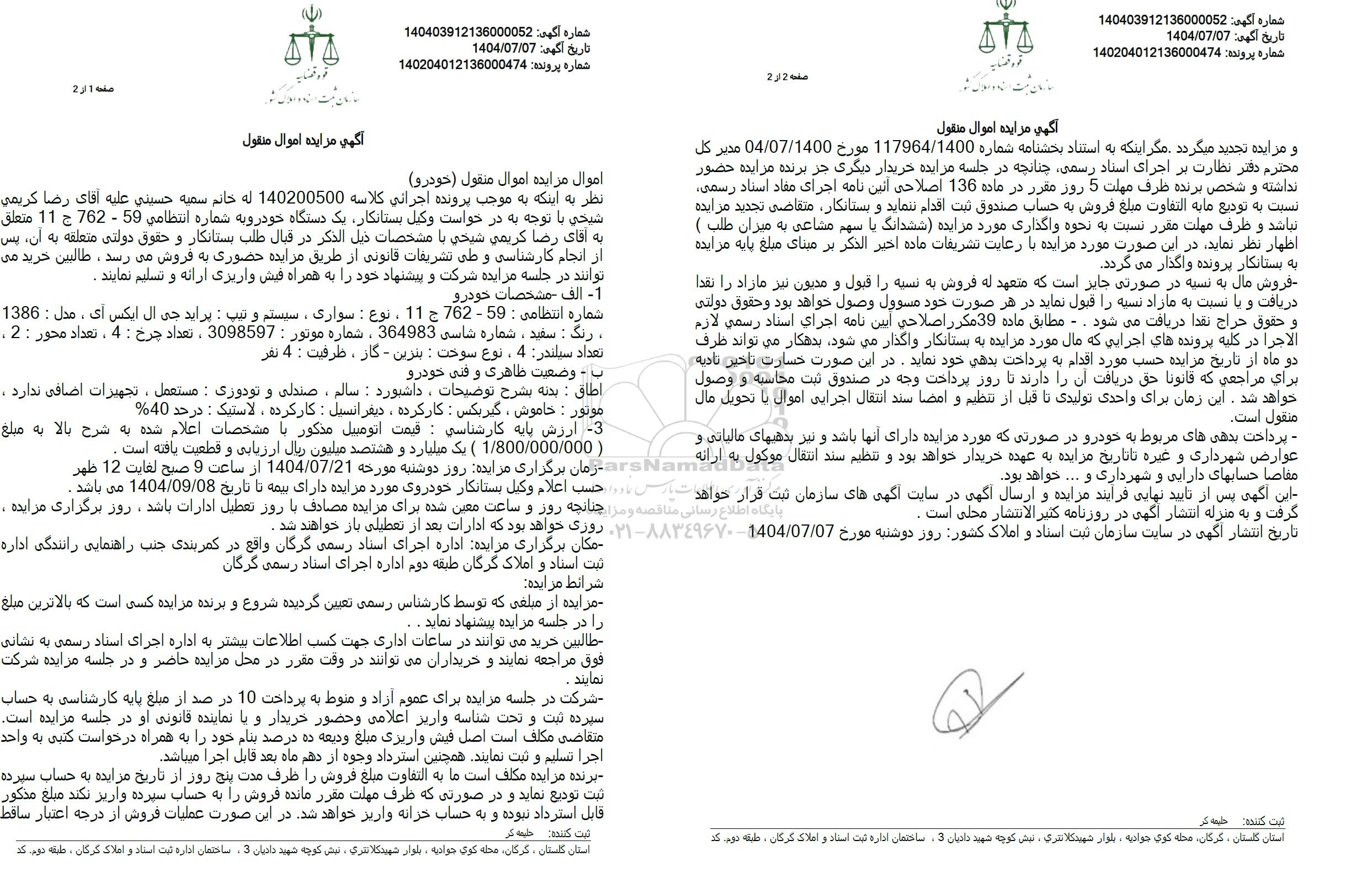 این آگهی پس از تایید نهایی فرایند مزایده و ارسال آگهی در سایت آگهی های سازمان ثبت قرار خواهد گرفت و به منزله انتشار آگهی در روزنامه کثیر الانتشار محلی است . تاريخ انتشار آگهی در سایت سازمان ثبت اسناد و املاک کشور روز دوشنبه مورخ 1404.07.07