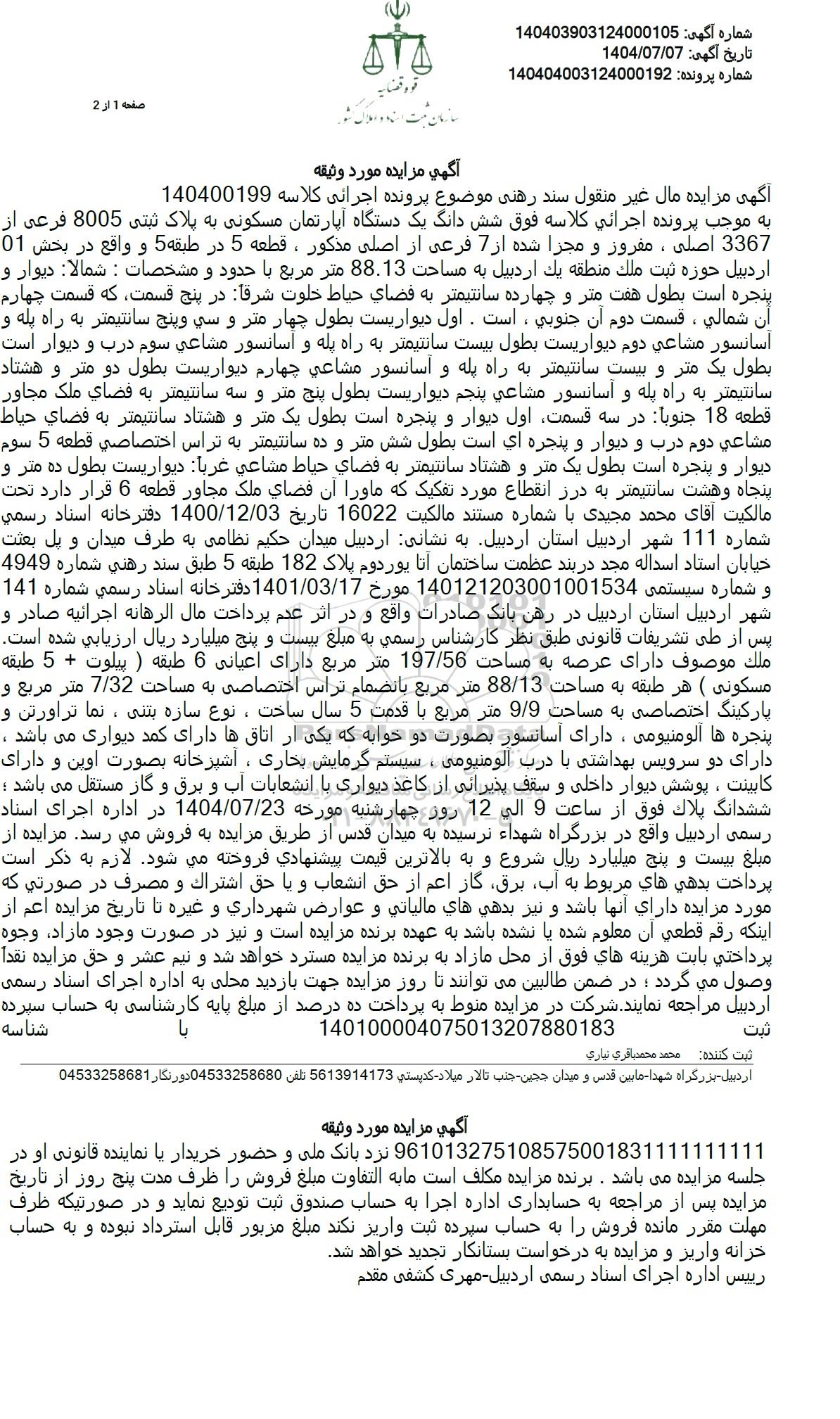 به موجب پرونده اجرائی کلاسه فوق شش دانگ یک دستگاه آپارتمان مسکونی به پلاک ثبتی 8005 فرعی از 3367 اصلی، مفروز و مجزا شده از 7 فرعی از اصلی مذکور، قطعه 5 در طبقه 5 و واقع در بخش 01 اردبیل حوزه ثبت ملک منطقه یک اردبیل به مساحت 88.13 متر مربع با حدود و مشخصات : شمالا دیوار و پنجره است بطول هفت متر و چهارده سانتیمتر به فضای حیاط خلوت شرقا در پنج قسمت که قسمت چهارم ان شمالی ، قسمت دوم آن جنوبی ، است. اول دیواریست بطول چهار متر و سی و پنج سانتیمتر به راه پله و آسانسور مشاعی دوم دیواریست بطول بیست سانتیمتر به راه پله و آسانسور مشاعی سوم درب و دیوار است بطول یک متر و بیست سانتیمتر به راه پله و آسانسور مشاعی چهارم دیواریست بطول دو متر و هشتاد سانتیمتر به راه پله و آسانسور مشاعی پنجم دیواریست بطول پنج متر و سه سانتیمتر به فضای ملک مجاور قطعه 18 جنوبا در سه قسمت اول دیوار و پنجره است بطول یک متر و هشتاد سانتیمتر به فضای حیاط مشاعی دوم درب و دیوار و پنجره ای است بطول شش متر و ده سانتیمتر به تراس اختصاصی قطعه 5 سوم دیوار و پنجره است بطول یک متر و هشتاد سانتیمتر به فضای حیاط مشاعی غرباً: دیواریست بطول ده متر و پنجاه و هشت سانتیمتر به درز انقطاع مورد تفکیک که ماورا آن فضای ملک مجاور قطعه 6 قرار دارد تحت مالکیت آقای محمد مجیدی با شماره مستند مالکیت 16022 تاریخ 1400.12.03 دفترخانه اسناد رسمی شماره 111 شهر اردبیل استان اردبیل به نشانی اردبیل میدان حکیم نظامی به طرف میدان و پل بعثت خیابان استاد اسداله مجد در بند عظمت ساختمان آنا یوردوم پلاک 182 طبقه 5 طبق سند رهنی شماره 4949 و شماره سیستمی 140121203001001534 مورخ 1401.03.17 دفترخانه اسناد رسمی شماره 141 شهر اردبیل استان اردبیل در رهن بانک صادرات واقع و در اثر عدم پرداخت مال الرهانه اجرائیه صادر و پس از طی تشریفات قانونی طبق نظر کارشناس رسمی به مبلغ بیست و پنج میلیارد ریال ارزیابی شده است. ملک موصوف دارای عرصه به مساحت 197.56 متر مربع دارای اعیانی 6 طبقه پیلوت + 5 طبقه مسکونی هر طبقه به مساحت 88.13 متر مربع بانضمام تراس اختصاصی به مساحت 7.32 متر مربع و پارکینگ اختصاصی به مساحت 9.9 متر مربع با قدمت 5 سال ساخت ، نوع سازه بتنی ، نما تراورتن و پنجره ها آلومنیومی، دارای آسانسور بصورت دو خوابه که یکی از اتاقها دارای کمد دیواری می باشد . دارای دو سرویس بهداشتی با درب آلومنیومی ، سیستم گرمایش بخاری ، آشپزخانه بصورت اوین و دارای کابینت ، پوشش دیوار داخلی و سقف پذیرائی از کاغذ دیواری با انشعابات آب و برق و گاز مستقل می باشد . ششدانگ پلاک فوق از ساعت 9 الی 12 روز چهارشنبه مورخه 1404.07.23 در اداره اجرای استاد رسمی اردبیل واقع در بزرگراه شهداء نرسیده به میدان قدس از طریق مزایده به فروش می رسد. مزایده از مبلغ بیست و پنج میلیارد ریال شروع و به بالاترین قیمت پیشنهادی فروخته می شود. لازم به ذکر است پرداخت بدهی های مربوط به آب برق گاز اعم از حق انشعاب و یا حق اشتراک و مصرف در صورتی که مورد مزایده دارای آنها باشد و نیز بدهی های مالیاتی و عوارض شهرداری و غیره تا تاریخ مزایده اعم از اینکه رقم قطعی ان معلوم شده یا نشده باشد به عهده برنده مزایده است و نیز در صورت وجود مازاد وجوه پرداختی بابت هزینه های فوق از محل مازاد به برنده مزایده مسترد خواهد شد و تیم عشر و حق مزایده نقدا وصول می گردد؛ در ضمن طالبین میتوانند تا روز مزایده جهت بازدید محلی به اداره اجرای اسناد رسمی اردبیل مراجعه نمایند. شرکت در مزایده منوط به پرداخت ده درصد از مبلغ پایه کارشناسی به حساب سپرده ثبت 140100004075013207880183 شناسه 961013275108575001831111111111 نزد بانک ملی و حضور خریدار یا نماینده قانونی او در جلسه مزایده میباشد. برنده مزایده مکلف است ما به التفاوت مبلغ فروش را ظرف مدت پنج روز از تاریخ مزایده پس از مراجعه به حسابداری اداره اجرا به حساب صندوق ثبت تودیع نماید و در صورتیکه ظرف مهلت مقرر مانده فروش را به حساب سپرده ثبت واریز نکند مبلغ مزبور قابل استرداد نبوده و به حساب خزانه واریز و مزایده 