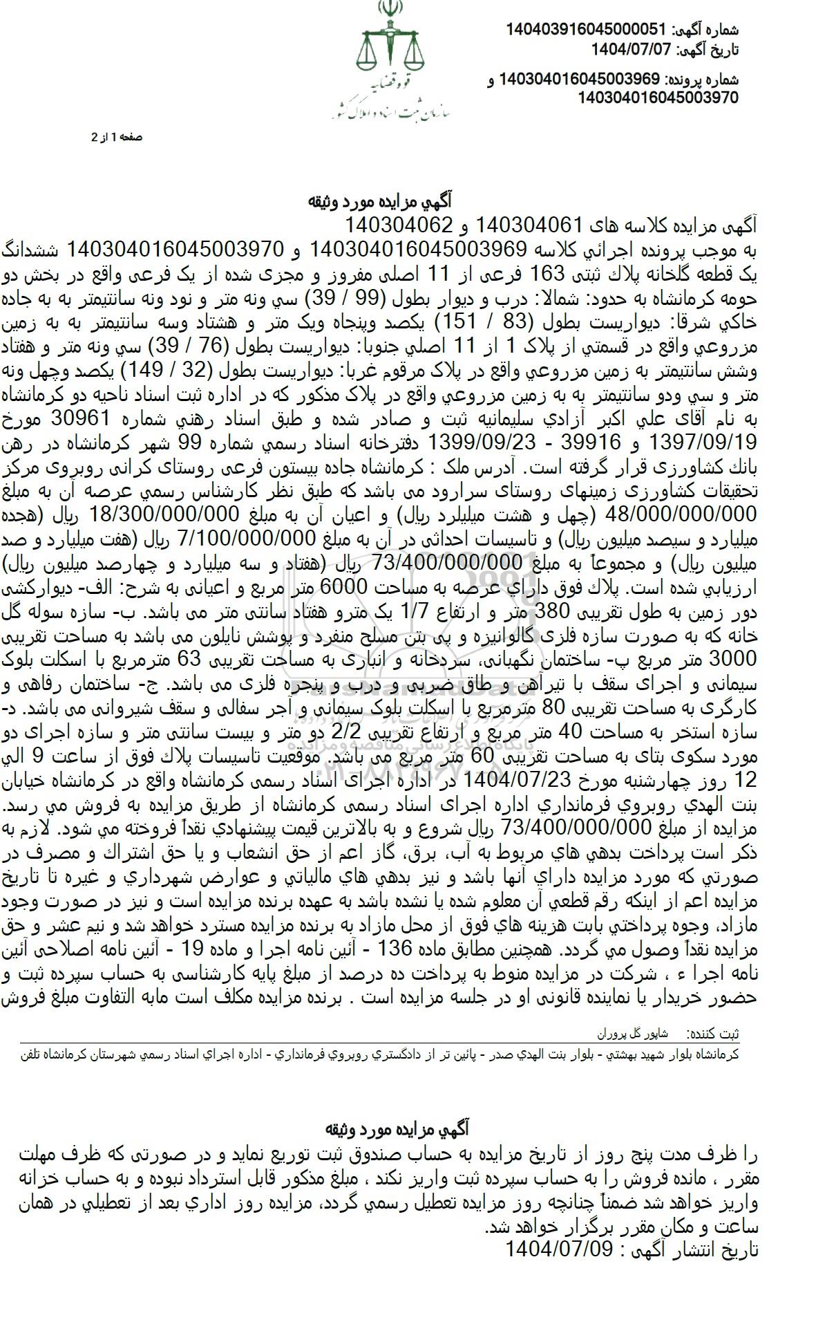 آگهی مزایده کلاسه های 140304061 و 140304062 به موجب پرونده اجرائی كلاسه 140304016045003969 و 140304016045003970 ششدانگ (151.83) یک قطعه گلخانه پلاک ثبتی 163 فرعی از 11 اصلی مفرور و مجری شده از یک فرعی واقع در بخش دو حومه کرمانشاه به حدود شمالا درب و ديوار بطول (99) . (39) سي و نه متر و نود و نه سانتیمتر به به جاده خاكي شرقا ديواريست بطول 83 . 151) یکصد و پنجاه و یک متر و هشتاد و سه سانتیمتر به به زمین مزروعی واقع در قسمتی از پلاک 1 از 11 اصلي جنوبا دیواریست بطول (76 . 39) سي و نه متر و هفتاد وشش سانتیمتر به زمین مزروعی واقع در پلاک مرقوم غربا دیواریست بطول (32) . 149) یکصد و چهل و نه متر و سي و دو سانتیمتر به به زمین مزروعی واقع در پلاک مذکور که در اداره ثبت اسناد ناحیه دو کرمانشاه به نام آقای علی اکبر آزادي سليمانيه ثبت و صادر شده و طبق استاد رهني شماره 30961 مورخ 1397.09.19 و 39916 - 1399.09.23 دفترخانه اسناد رسمی شماره 99 شهر کرمانشاه در رهن بانک کشاورزی قرار گرفته است. آدرس ملک: کرمانشاه جاده بیستون فرعی روستای کرانی روبروی مرکز تحقیقات کشاورزی زمینهای روستای سرارود میباشد که طبق نظر کارشناس رسمی عرصه آن به مبلغ 48.000.000.000 چهل و هشت میلیارد ریال و اعیان آن به مبلغ 18.300.000.000 ريال هجده میلیارد و سیصد میلیون ریال و تاسیسات احداثی در آن به مبلغ 7.100.000.000 ريال هفت میلیارد و صد میلیون ریال و مجموعا به مبلغ 73.400.000.000 ريال هفتاد و سه میلیارد و چهارصد میلیون ریال) ارزیابی شده است. پلاک فوق داراي عرصه به مساحت 6000 متر مربع و اعیانی به شرح الف دیوار کشی دور زمین به طول تقریبی 380 متر و ارتفاع 1.7 یک متر و هفتاد سانتی متر میباشد. ب- سازه سوله گل خانه که به صورت سازه فلزی گالوانیزه و پی بتن مسلح منفرد و پوشش نایلون میباشد به مساحت تقریبی 3000 متر مربع ب ساختمان نگهبانی سردخانه و انباری به مساحت تقریبی 63 متر مربع با اسکلت بلوک سیمانی و اجرای سقف با تیراهن و طاق ضربی و درب و پنجره فلزی میباشد. ج- ساختمان رفاهی و کارگری به مساحت تقریبی 80 متر مربع با اسکلت بلوک سیمانی و آجر سفالی و سقف شیروانی می باشد. د-سازه استخر به مساحت 40 متر مربع و ارتفاع تقریبی 2.2 دو متر و بیست سانتی متر و سازه اجرای دو مورد سکوی بتای به مساحت تقریبی 60 متر مربع میباشد. موقعیت تاسيسات پلاك فوق از ساعت 9 الی 12 روز چهارشنبه مورخ 1404.07.23 در اداره اجرای اسناد رسمی کرمانشاه واقع در کرمانشاه خیابان بنت الهدی روبروی فرمانداری اداره اجرای اسناد رسمی کرمانشاه از طریق مزایده به فروش می رسد. مزایده از مبلغ 73.400.000.000 ریال شروع و به بالاترین قیمت پیشنهادی نقداً فروخته می شود. لازم به ذکر است پرداخت بدهي هاي مربوط به آب برق گاز اعم از از حق انشعاب و یا حق اشتراك و مصرف در صورتی که مورد مزایده دارای آنها باشد و نيز بدهي هاي مالياتي و عوارض شهرداری و غیره تا تاریخ مزایده اعم از اینکه رقم قطعی آن معلوم شده یا نشده باشد به عهده برنده مزایده است و نیز در صورت وجود مازاد وجوه پرداختی بابت هزينه هاي فوق از محل مازاد به برنده مزایده مسترد خواهد شد و نیم عشر و حق مزايده نقداً وصول می گردد همچنین مطابق ماده 136 - آئین نامه اجرا و ماده 19 - آئین نامه اصلاحی آئین نامه اجراء ، شرکت در مزایده منوط به پرداخت ده درصد از مبلغ پایه کارشناسی به حساب سپرده ثبت و حضور خریدار یا نماینده قانونی او در جلسه مزایده است.