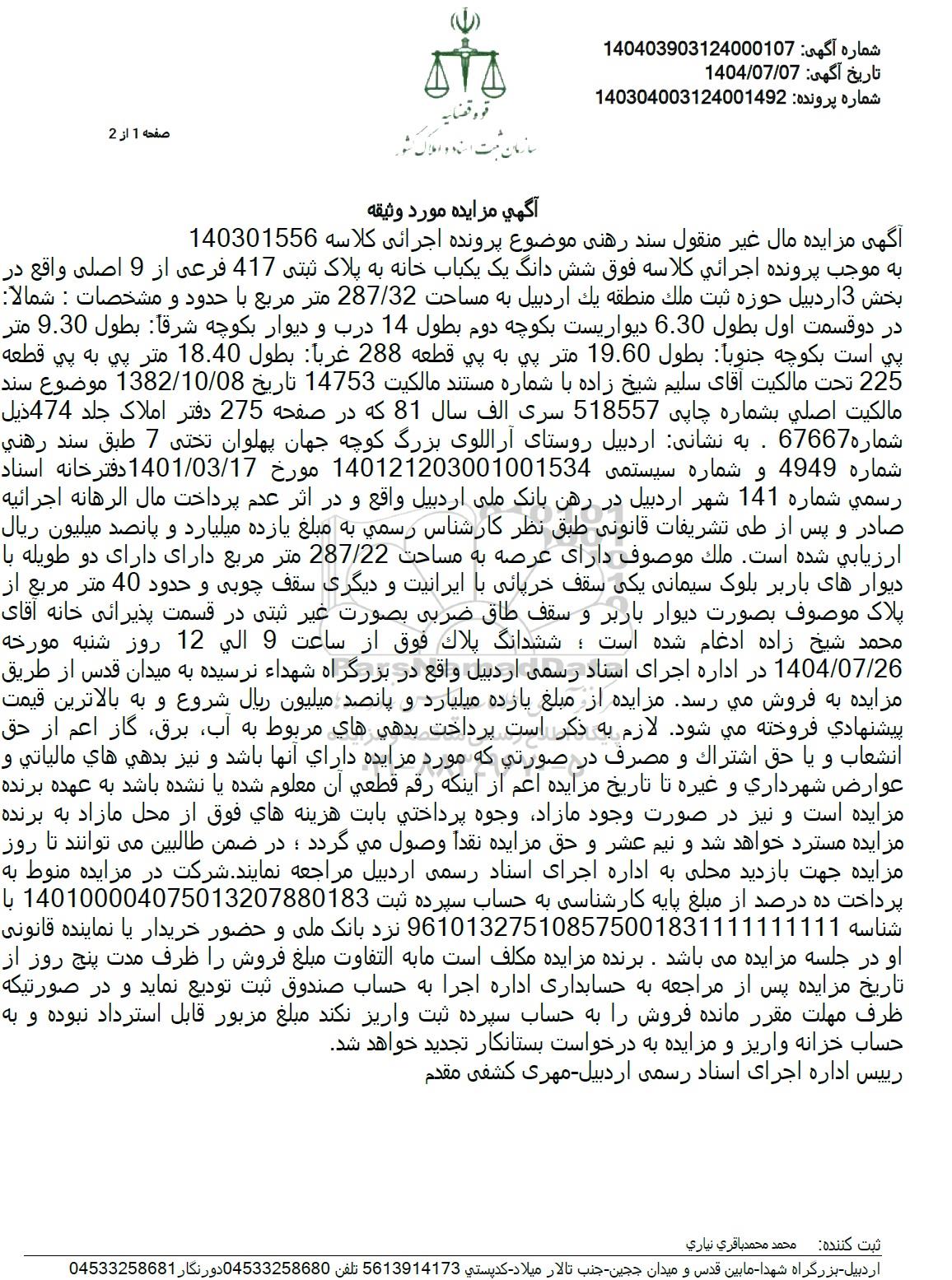 آگهی مزایده مال غیر منقول سند رهنی موضوع پرونده اجرائی کلاسه 140301556