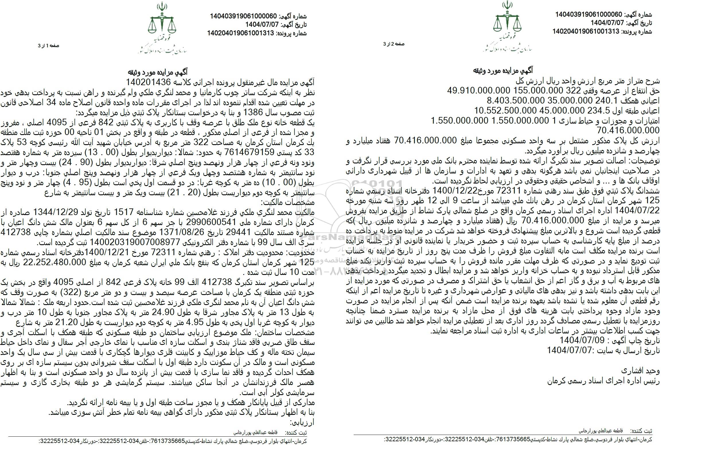 ششدانگ پلاک ثبتی فوق طبق سند رهنی شماره 72311 مورخ 1400/12/22 دفترخانه اسناد رسمی شماره 125 شهر کرمان استان کرمان در رهن بانک ملی میباشد از ساعت 9 الی 12 ظهر روز سه شنبه مورخه 1404.07.22 اداره اجرای اسناد رسمی کرمان واقع در ضلع شمالی پارک نشاط از طریق مزایده بفروش میرسد و مزایده از مبلغ 70.416.000.000 ریال (هفتاد میلیارد و چهارصد و شانزده میلیون ریال که قطعی گردیده است شروع و بالاترین مبلغ پیشنهادی فروخته خواهد شد شرکت در مزایده منوط به پرداخت ده درصد از مبلغ پایه کارشناسی به حساب سپرده ثبت و حضور خریدار با نماینده قانونی او در جلسه مزایده است برنده مزایده مکلف است ما به التفاوت مبلغ فروش را ظرف مدت پنج روز از تاریخ مزایده به حساب ثبت تودیع نماید و در صورتی که ظرف مهلت مقرر مانده فروش را به حساب سپرده ثبت واریز نکند مبلغ مذکور قابل استرداد نبوده و به حساب خزانه واریز خواهد شد و مزایده ابطال و تجدید میگردد پرداخت بدهی های مربوط به آب و برق و گاز اعم از حق انشعاب یا حق اشتراک و مصرف در صورتی که مورد مزایده از این بابت بدهی داشته باشد و نیز بدهی های مالیاتی و عوارض شهرداری و غیره تا تاریخ مزایده اعم از اینکه رقم قطعی أن معلوم شده یا نشده باشد بعهده برنده مزایده است ضمن آنکه پس از انجام مزایده در صورت وجود مازاد وجوه پرداختی بابت هزینه های فوق از محل مازاد به برنده مزایده مسترد ضمنا چنانچه روز مزایده با تعطیل رسمی مصادف گردد روز اداری بعد از تعطیلی مزایده انجام خواهد شد طالبین می توانند