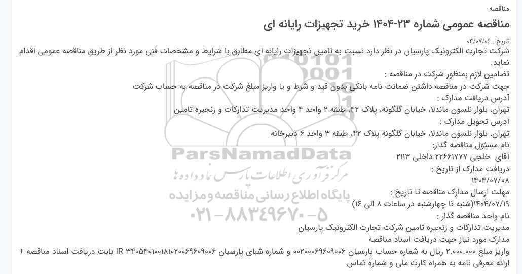 شرکت تجارت الکترونیک پارسیان در نظر دارد نسبت به تامین تجهیزات رایانه ای مطابق با شرایط و مشخصات فنی مورد نظر از طریق مناقصه عمومی اقدام نماید.